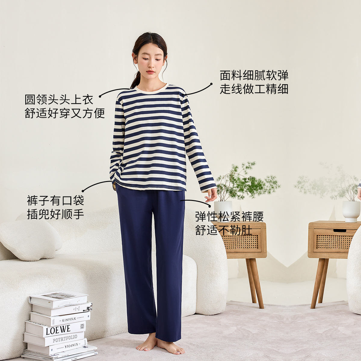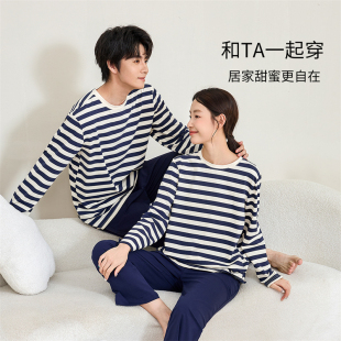 套装 宽松家居服休闲条纹男大码 柔软棉长袖 贝妍情侣睡衣女春秋新款