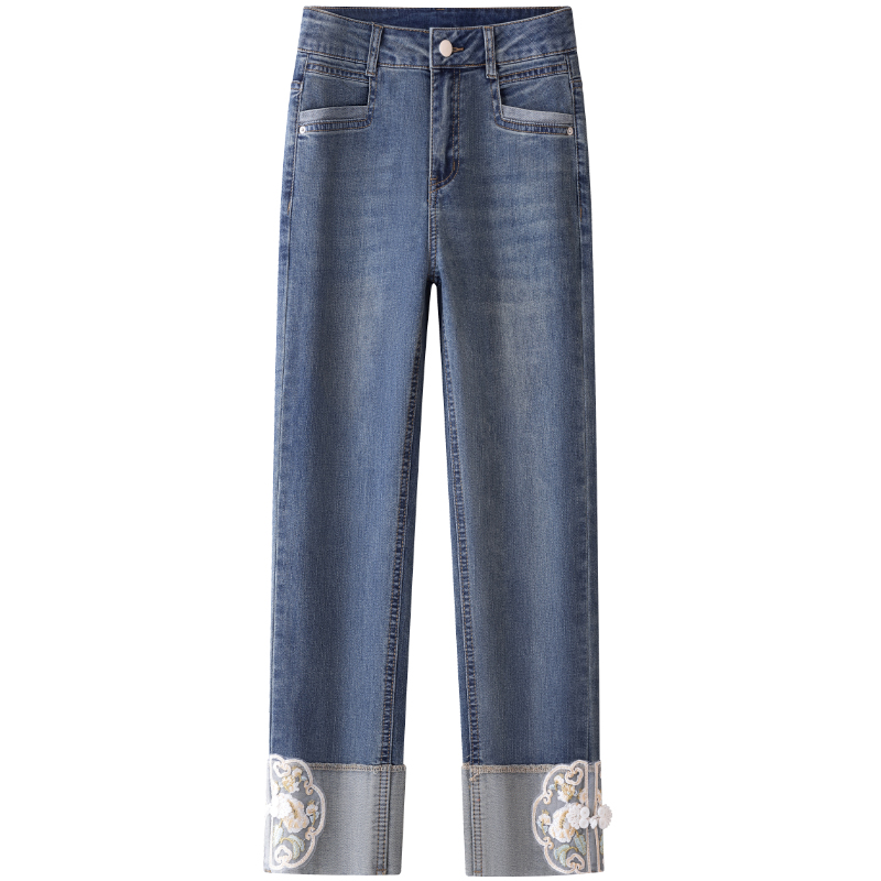 女秋季 牛仔裤 2024年新款 哈伦裤 子 新中式 卷边九分裤 国风刺绣烟管裤