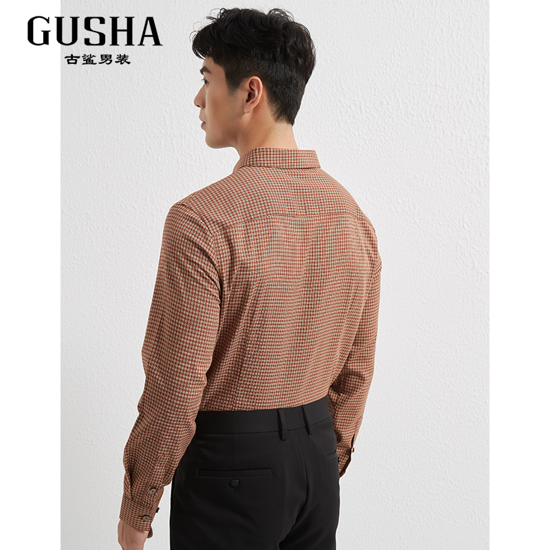 男竹纤维抗菌英伦复古长袖 古鲨橙色格子衬衫 衬衣2025年秋 清仓