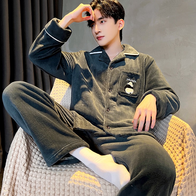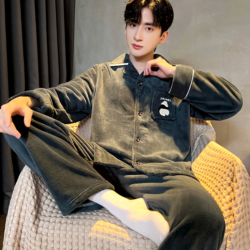 春秋大码 可外穿家居服保暖长袖 法兰绒 加厚珊瑚绒套装 睡衣男秋冬季