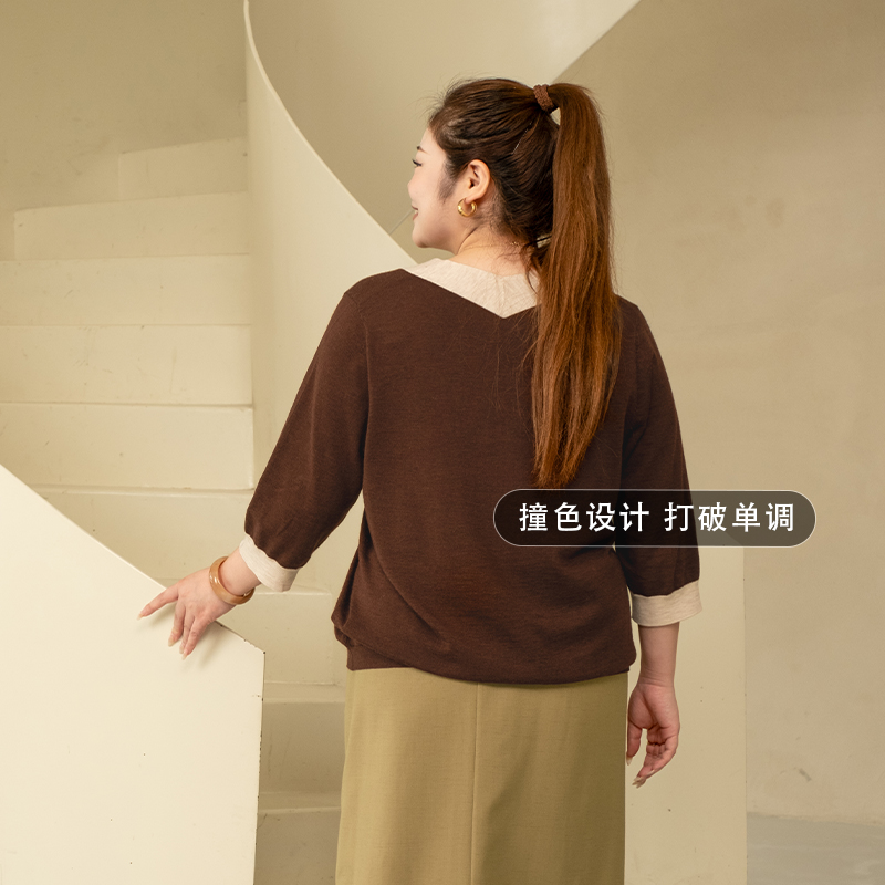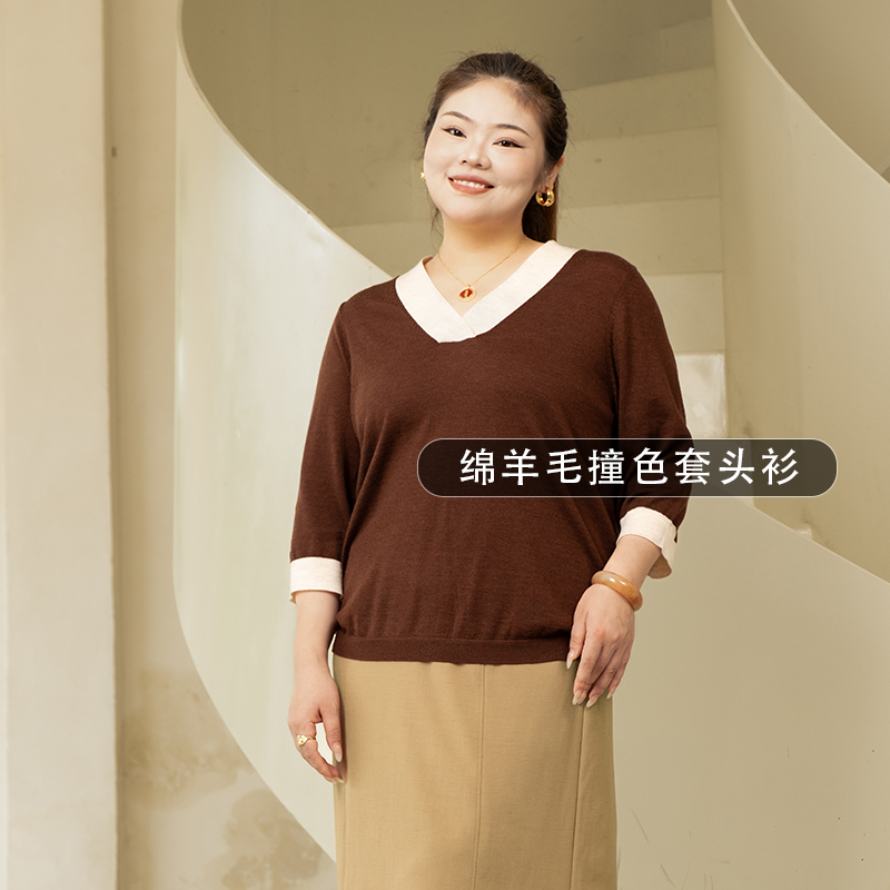胖mm七分袖 秋大码 美丽客栈别致撞色V领打底衫 套头衫 100绵羊毛