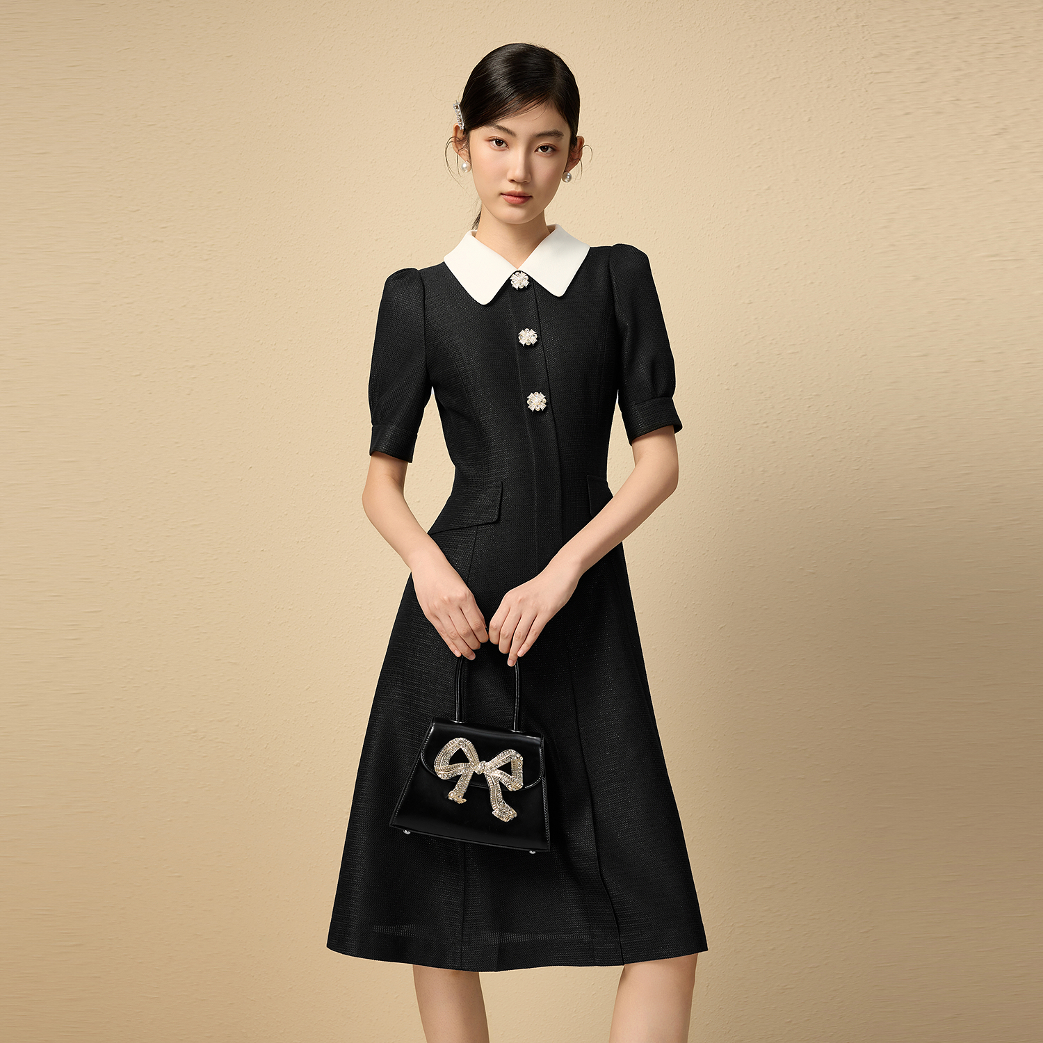 朗姿集团LIME莱茵优雅小香风收腰黑白撞色连衣裙25夏泡泡袖 A摆裙