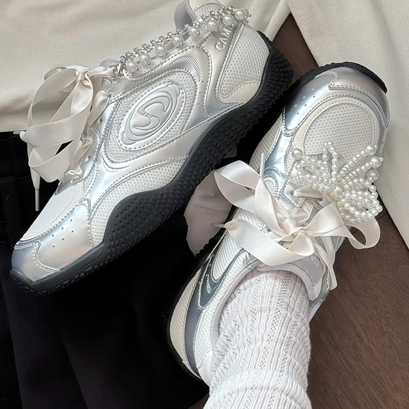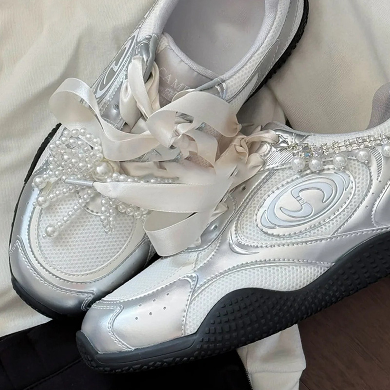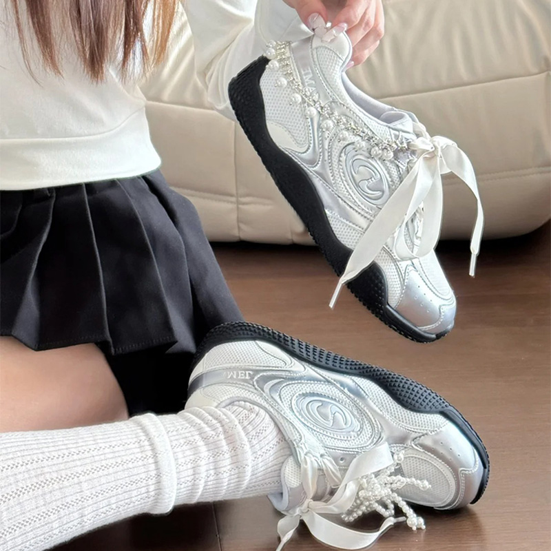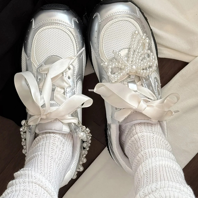 扣装 网纱女芭蕾风白色珍珠鞋 饰 带适用斐乐FILA银色鞋 吻婷人丝带鞋