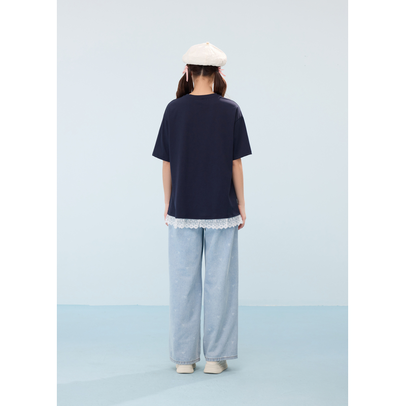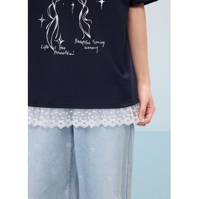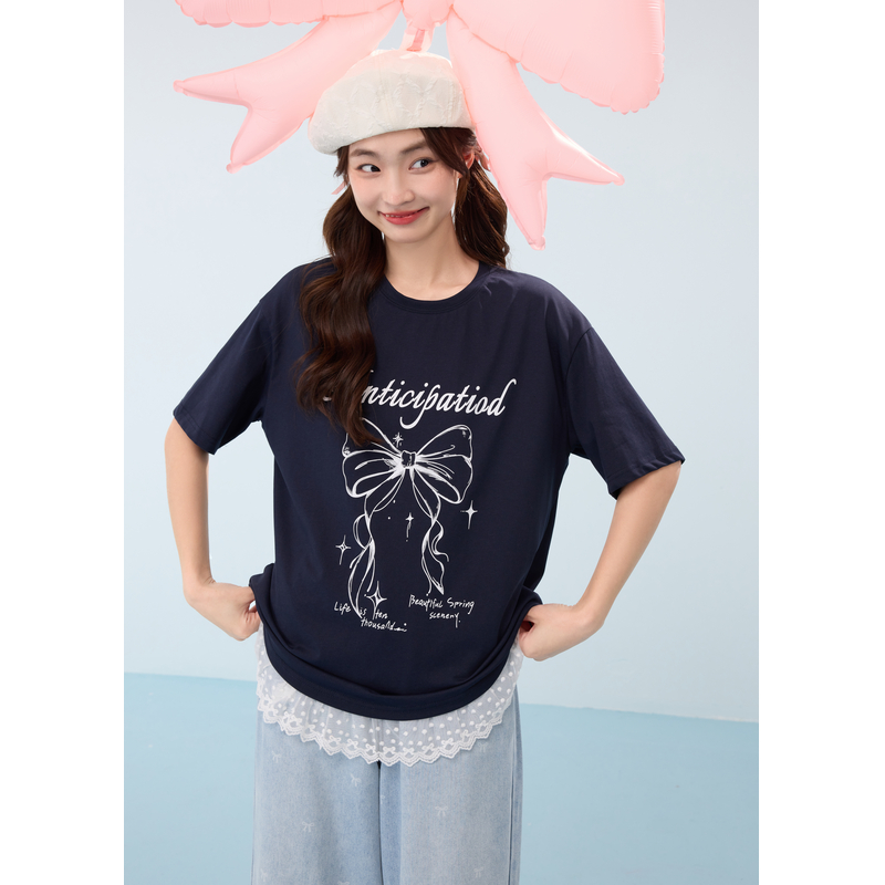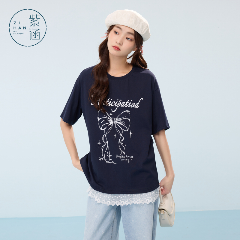 蕾丝花边圆领宽松显瘦上衣 新款 紫涵蝴蝶结印花短袖 T恤女2025夏季