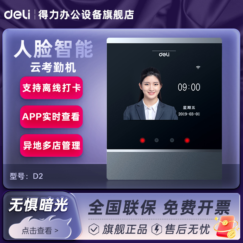 得力D5S人脸识别打卡考勤机智能云多店管理指纹面部识别公司企业员工上下班签到机打卡器D2企业微信一体机D7F