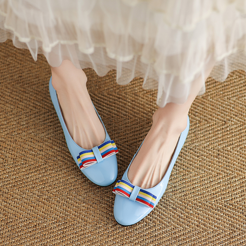 工作女鞋 漆皮蝴蝶结单鞋 圆头玛丽珍鞋 粗跟浅口真皮高跟鞋 平底瓢鞋
