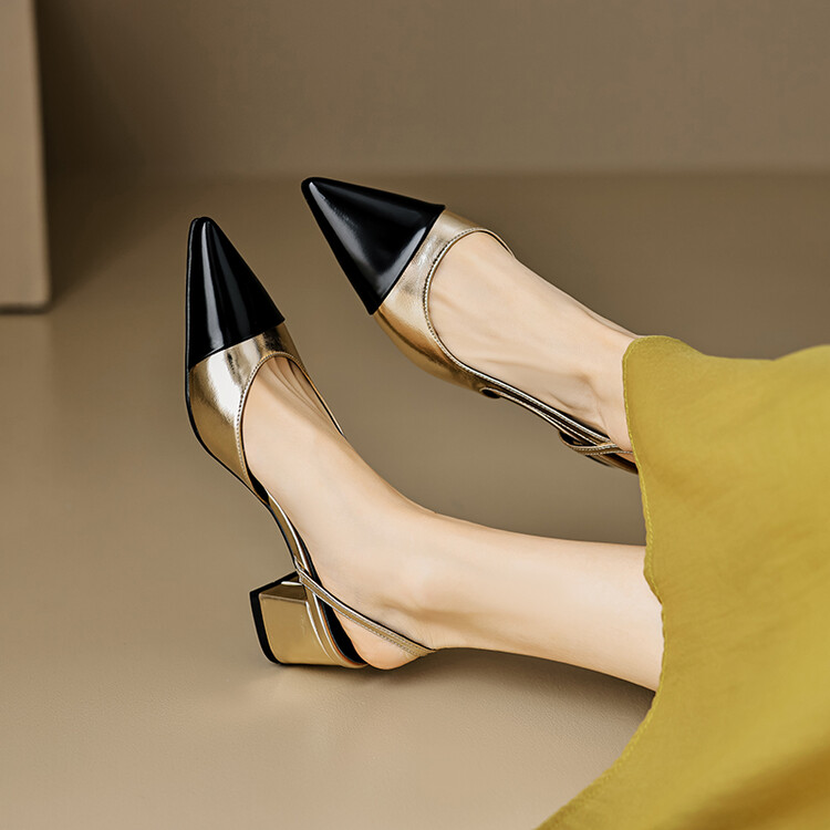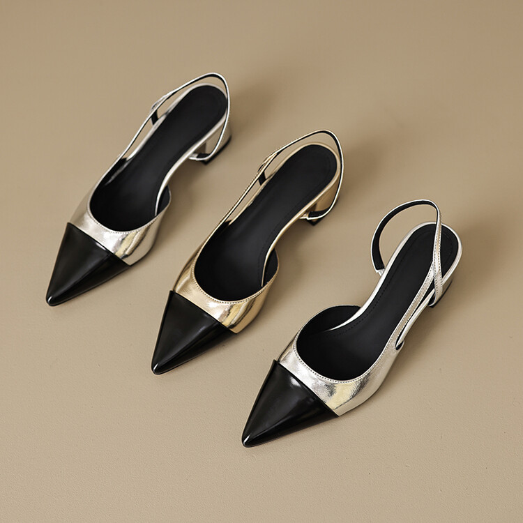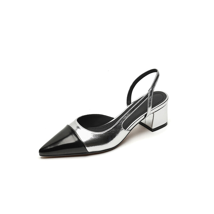 女夏尖头侧空单鞋 高级感拼色粗跟包头凉鞋 法式 女鞋