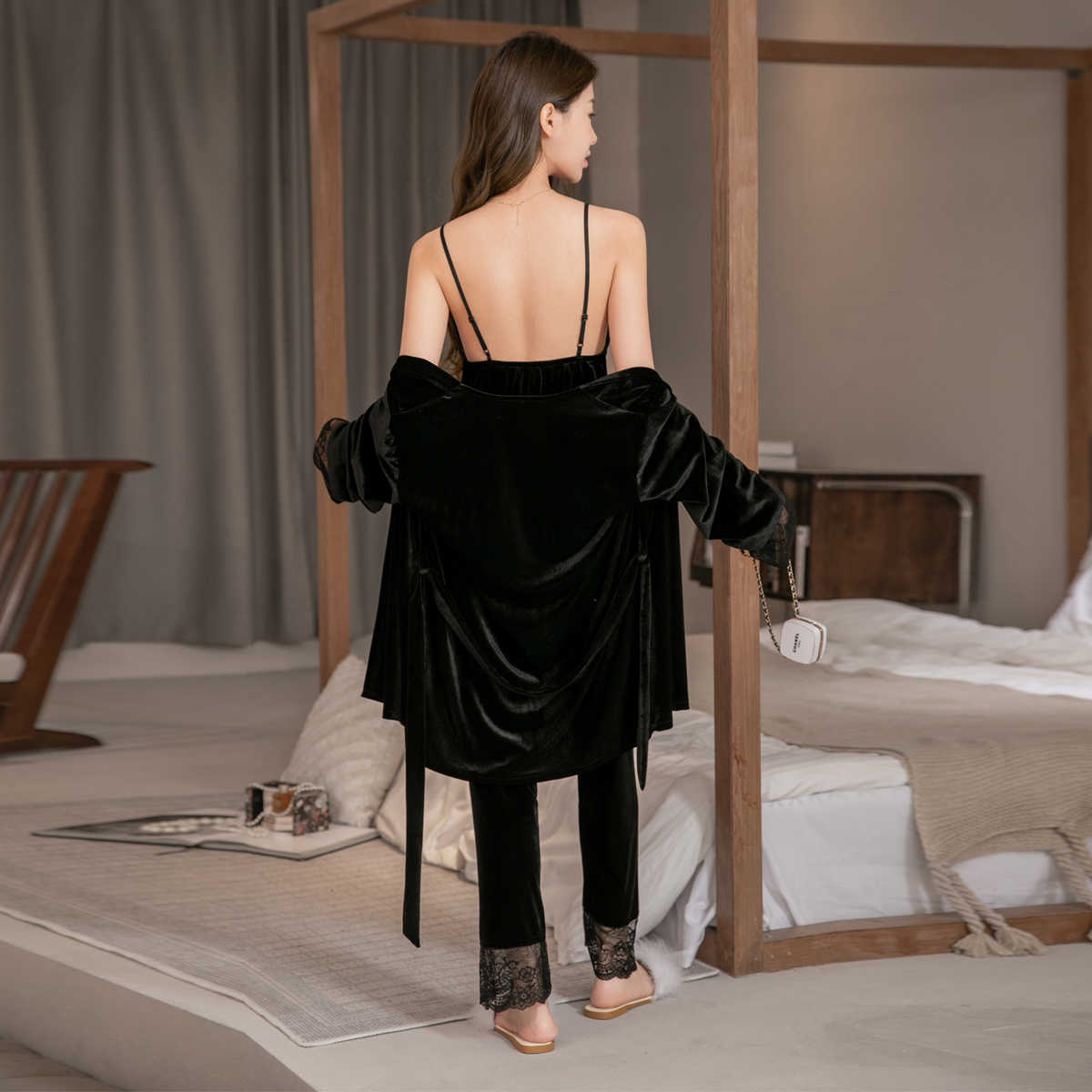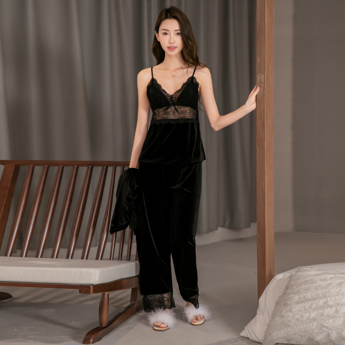 家居服高级感性感女套装 吊带长裤 三件套金丝绒长袖 女士睡衣秋冬季