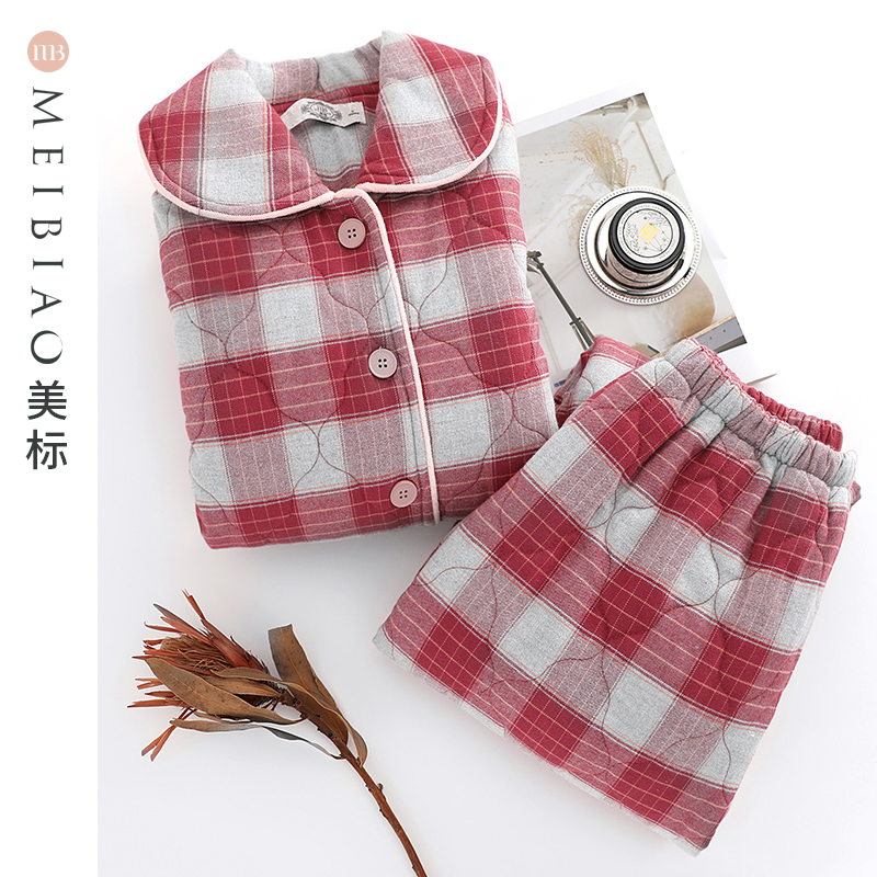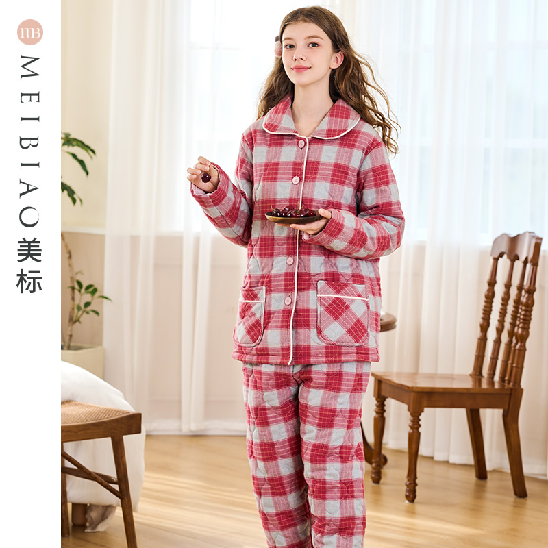 女秋冬格子全棉家居服 美标三层加厚夹棉纯棉睡衣套装 双11预售