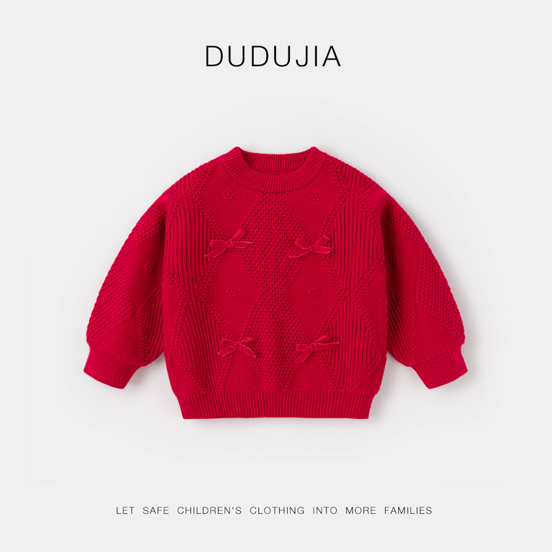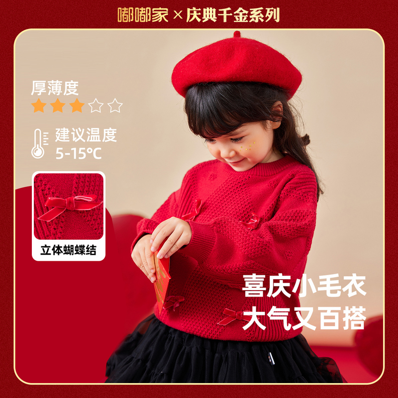 拜年服小香风 宝宝冬季 嘟嘟家女童毛衣儿童蝴蝶结打底针织衫 新年装
