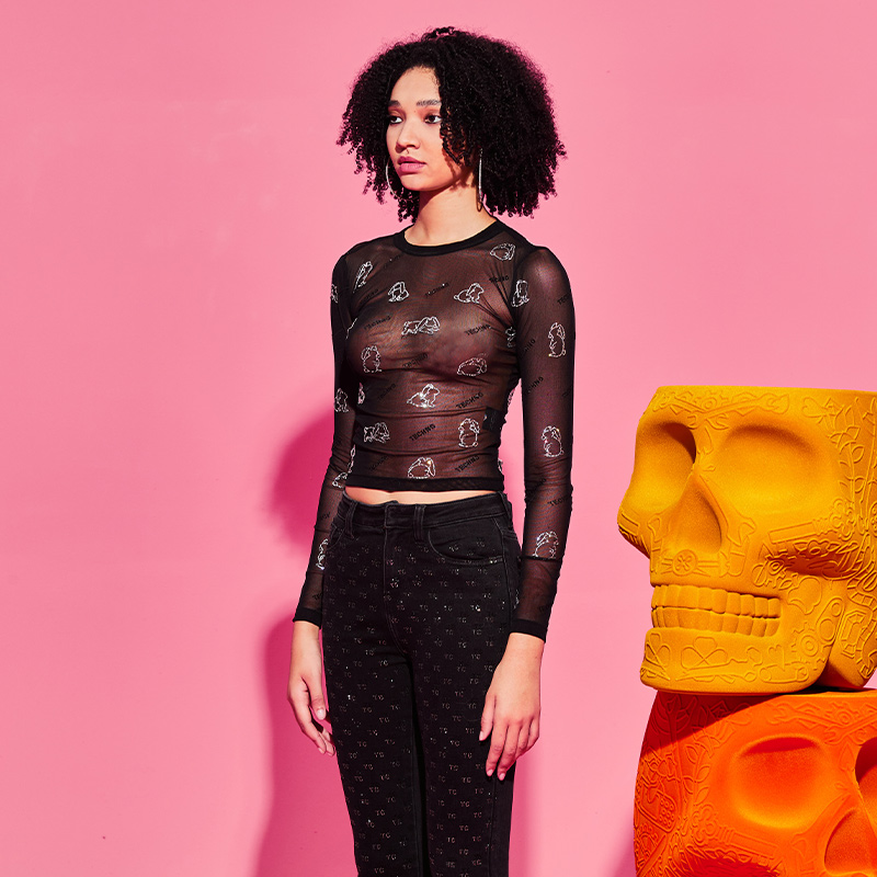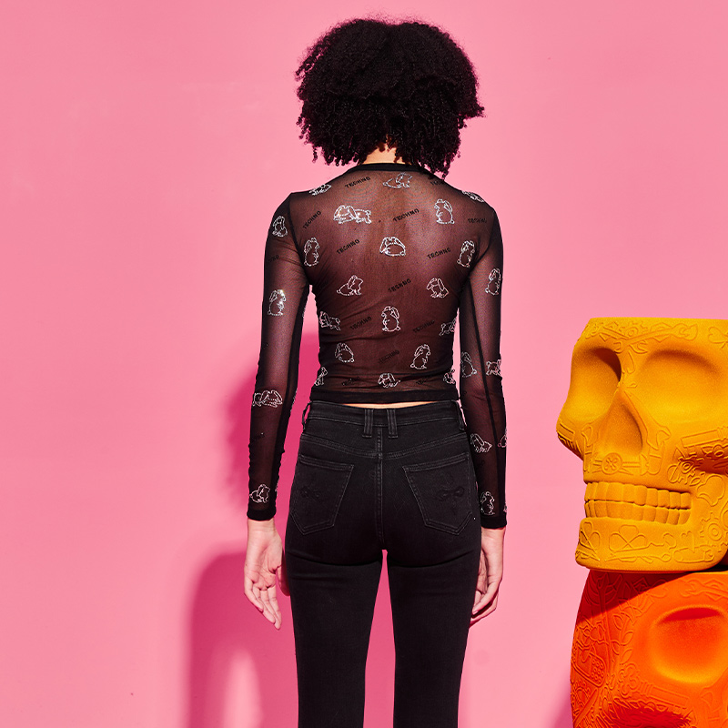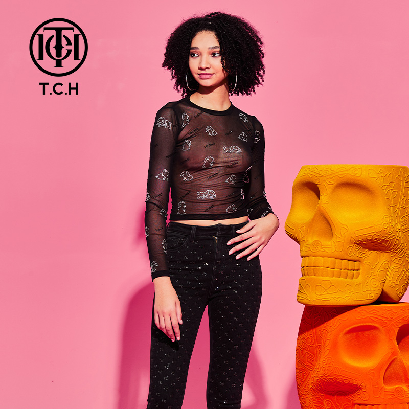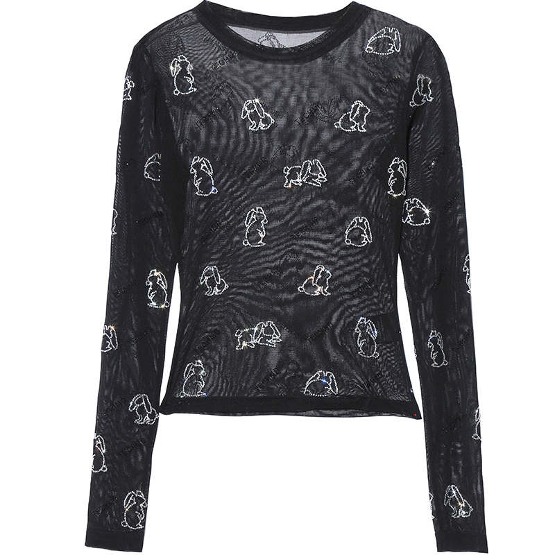 轻奢潮牌秋季 打底衫 新款 网纱长袖 T69D026007 烫钻修身 TCH
