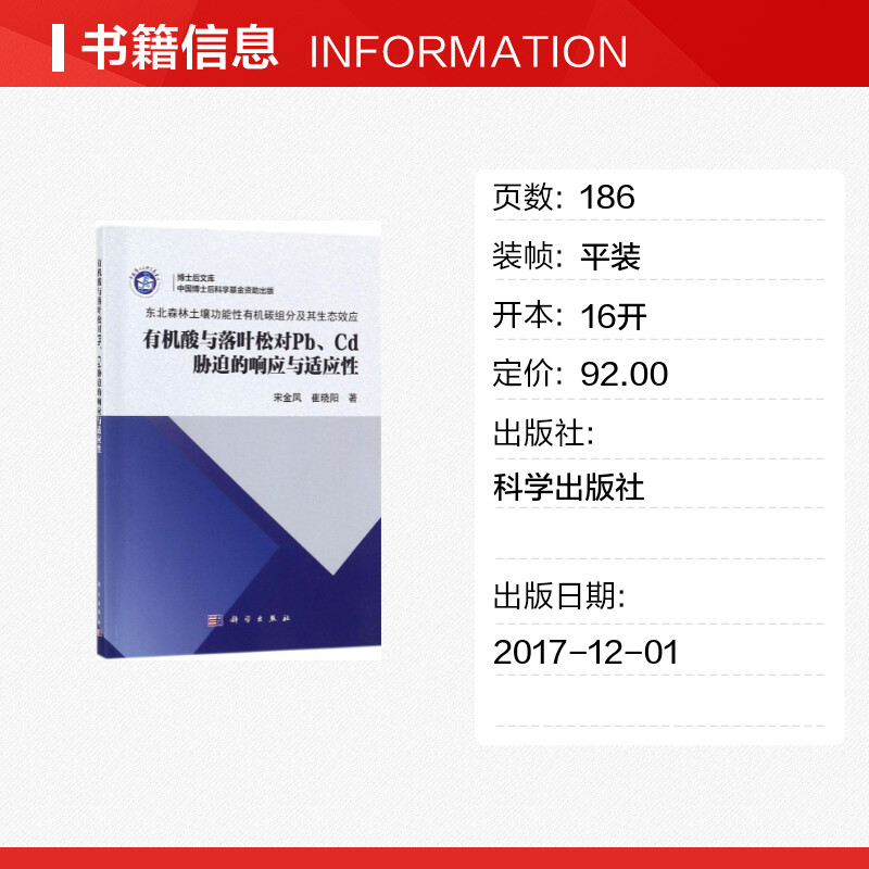 林业专业科技 社 响应与适应性 科学出版 图书籍 新华书店正版 著 崔晓阳 宋金凤 Cd胁迫 有机酸与落叶松对Pb