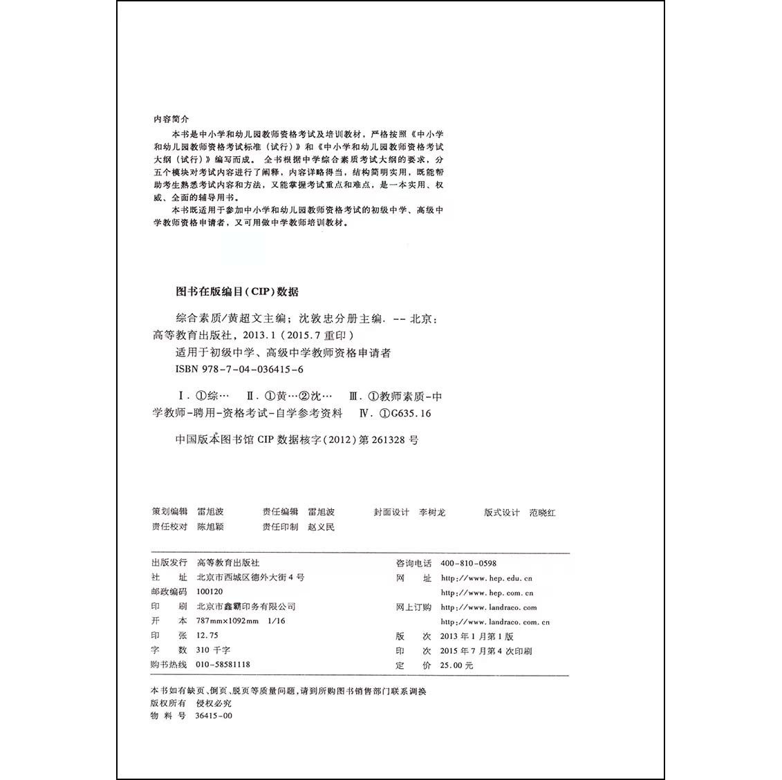 高级中学教师资格申请者 教师资格考试及培训教材 教师资格考试 综合素质 高等教育出版 适用于初级中学 教育学 社 黄超文