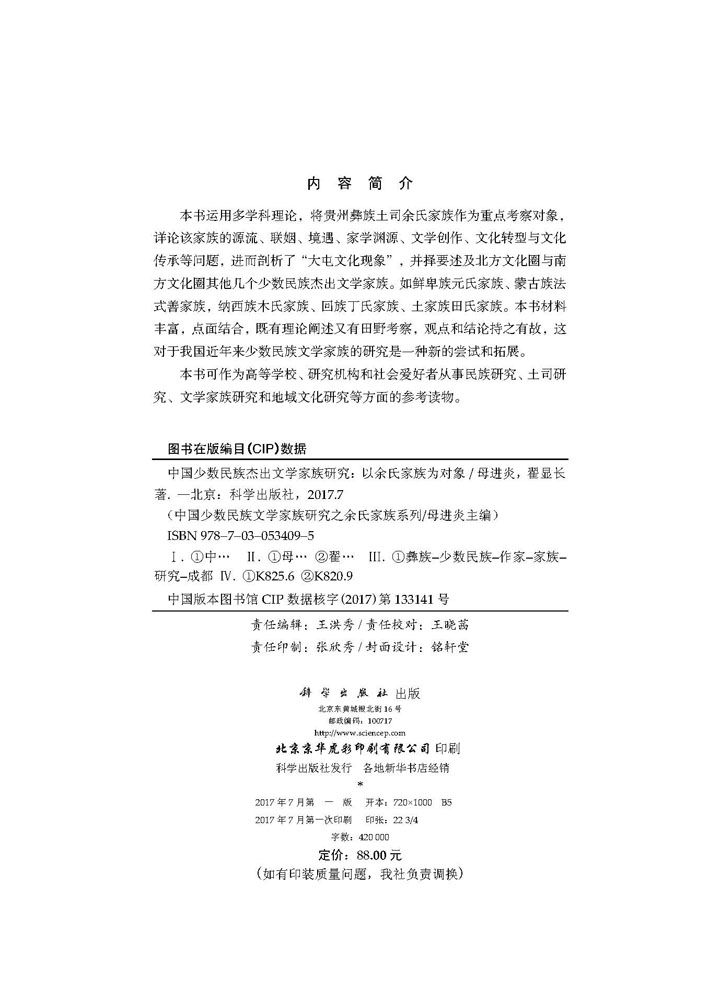 现货 科学出版 中国少数民族杰出文学家族研究——以余氏家族为对象 翟显长 社 母进炎 正版