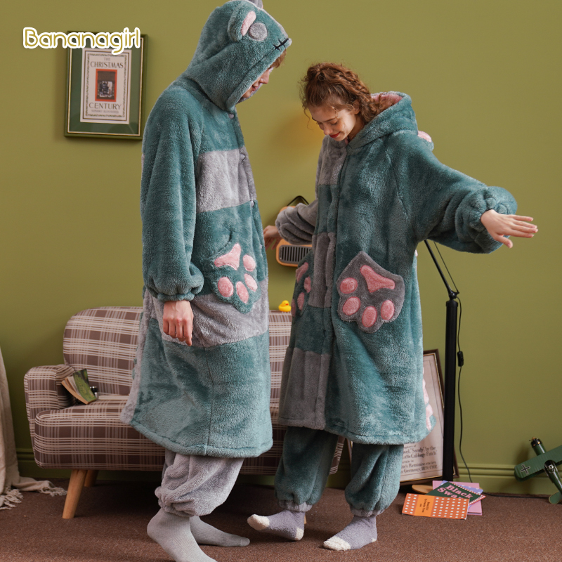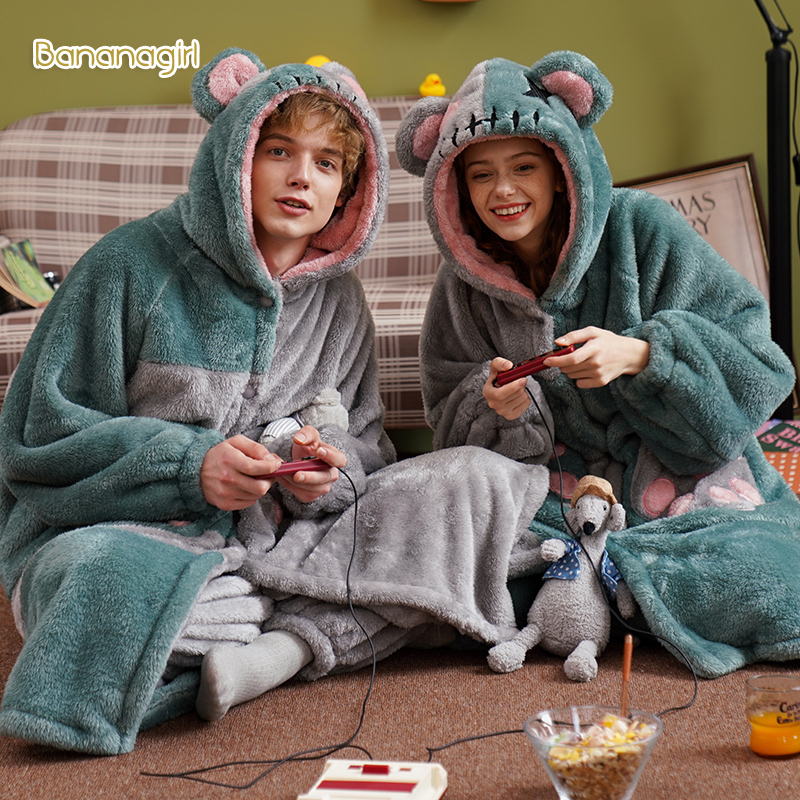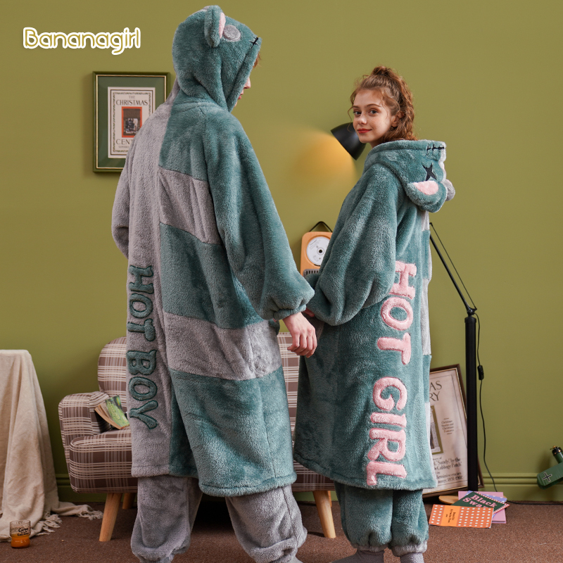 Bananagirl睡衣秋冬女珊瑚绒加厚加绒可爱情侣家居服男毛绒浴袍冬
