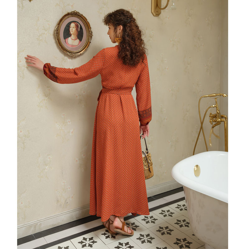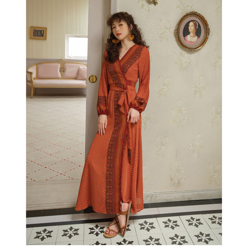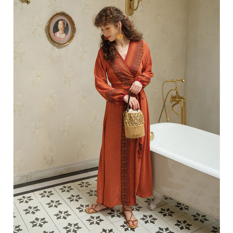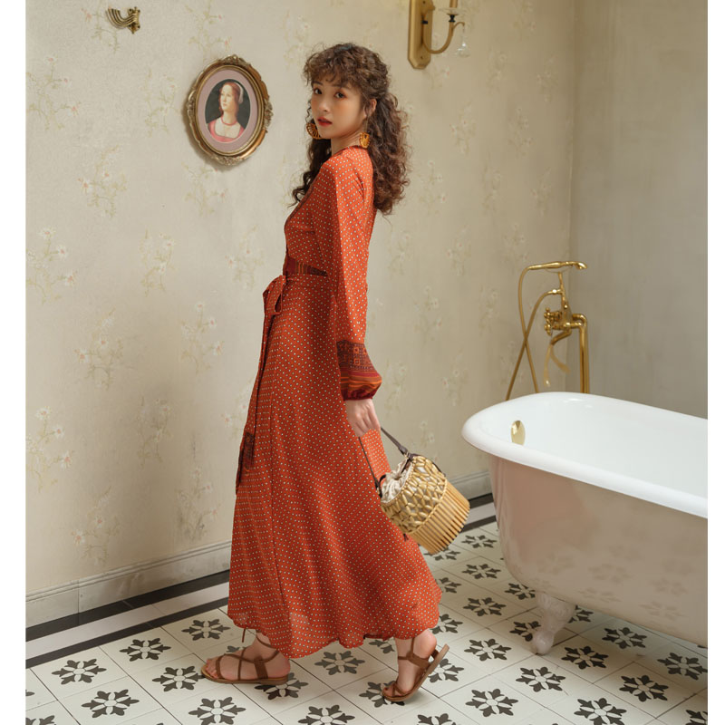 沙漠系带度假长裙 雪纺民族风长袖 复古收腰高腰一片式 连衣裙夏季
