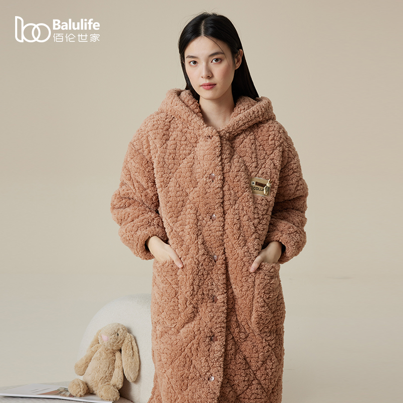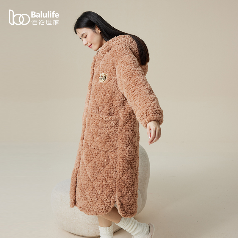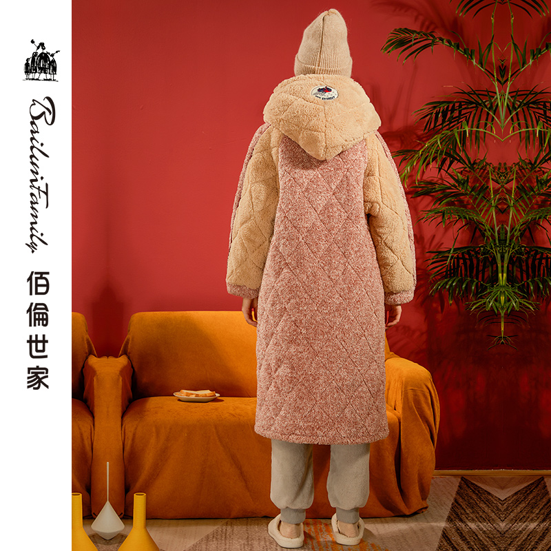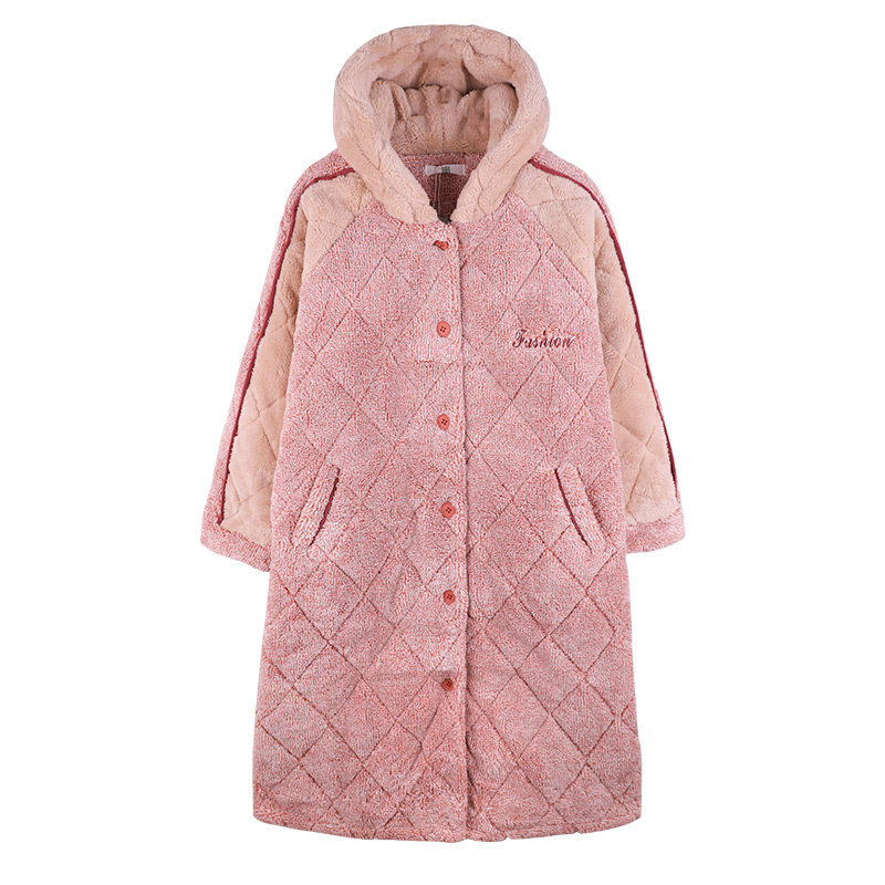 睡袍女冬加绒加厚三层夹棉珊瑚绒连帽睡衣法兰绒冬季 家居服加长款