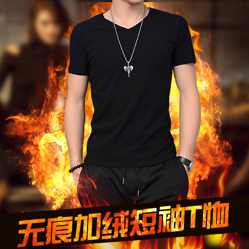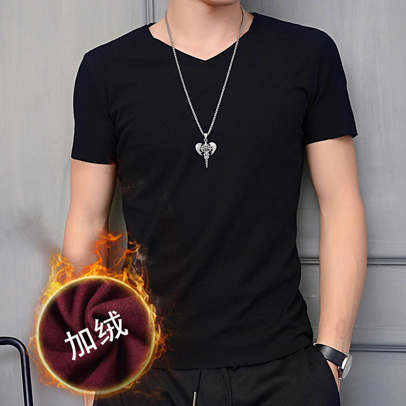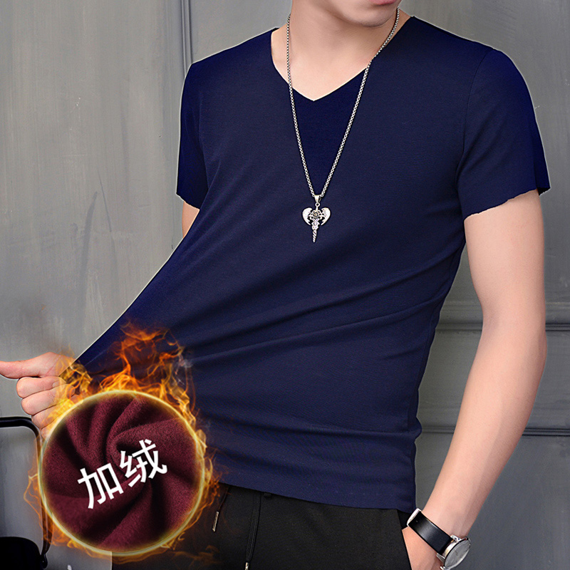 加厚紧身打底内衣青年保暖秋衣 v领体恤韩版 无痕加绒短袖 t恤男薄款