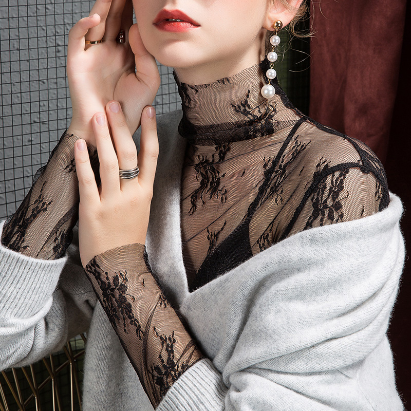 内搭透视绣花洋气高领蕾丝衫 秋季 女修身 2025春秋堆堆领网纱打底衫