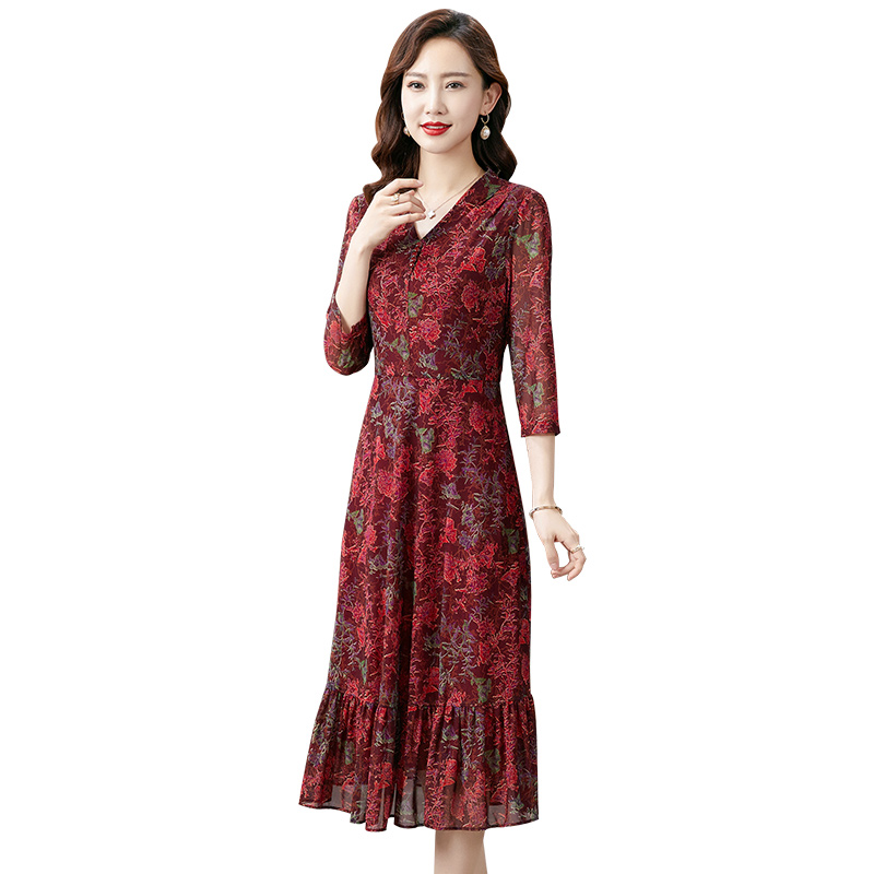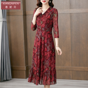M2女装 中年妈妈弹力收腰显瘦H型系带提花连衣裙 2025春秋宽松大码