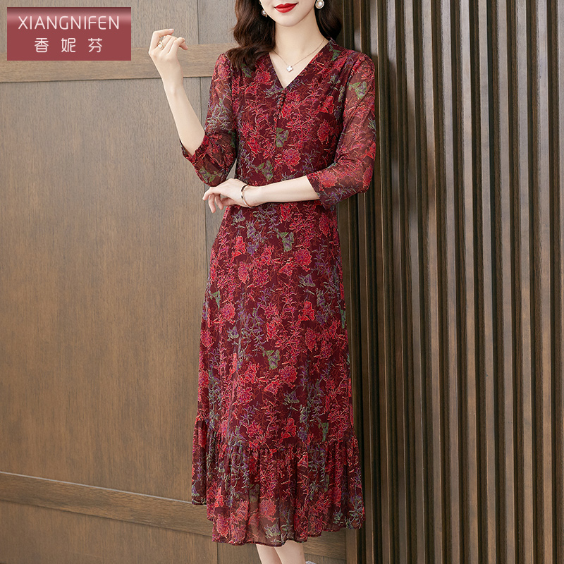 胖mm复古晕染碎花雪纺v领百褶连衣裙女25年春高级感气质度假短裙