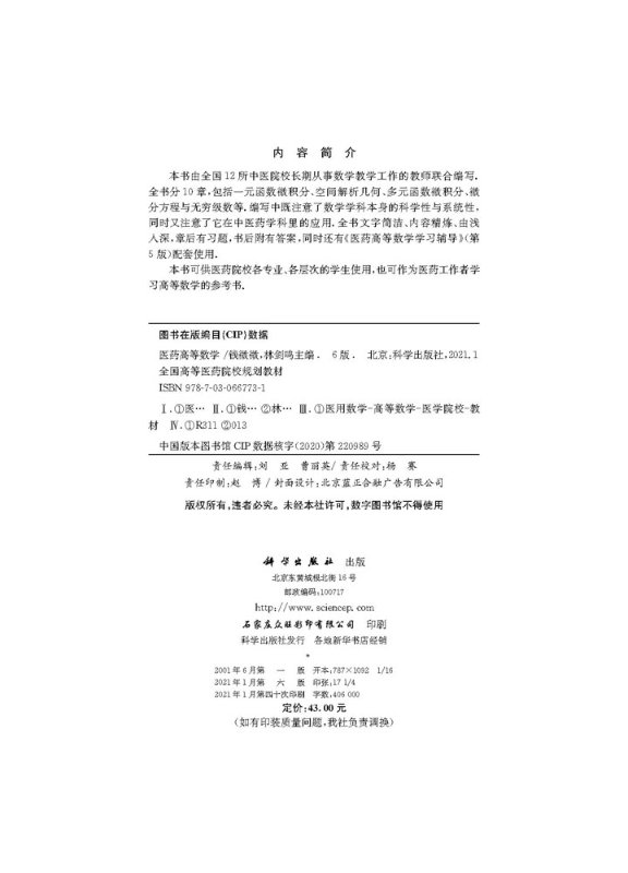 9787030667731 社 全国高等医药院校规划教材 由浅入深 钱微微 内容精炼 第6版 文字简洁 科学出版 正版 林剑鸣主编 医药高等数学