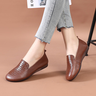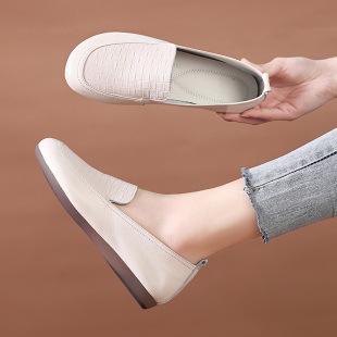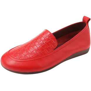 女2025年夏季 舒适圆头软底豆豆鞋 新款 大码 红色真皮妈妈鞋 平底单鞋