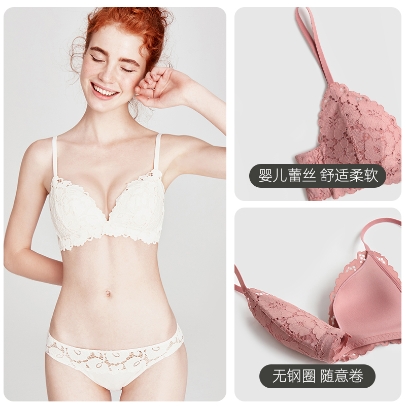 好奇蜜斯小胸聚拢内衣女薄显大无钢圈蕾丝文胸罩套装 防下垂夏 法式