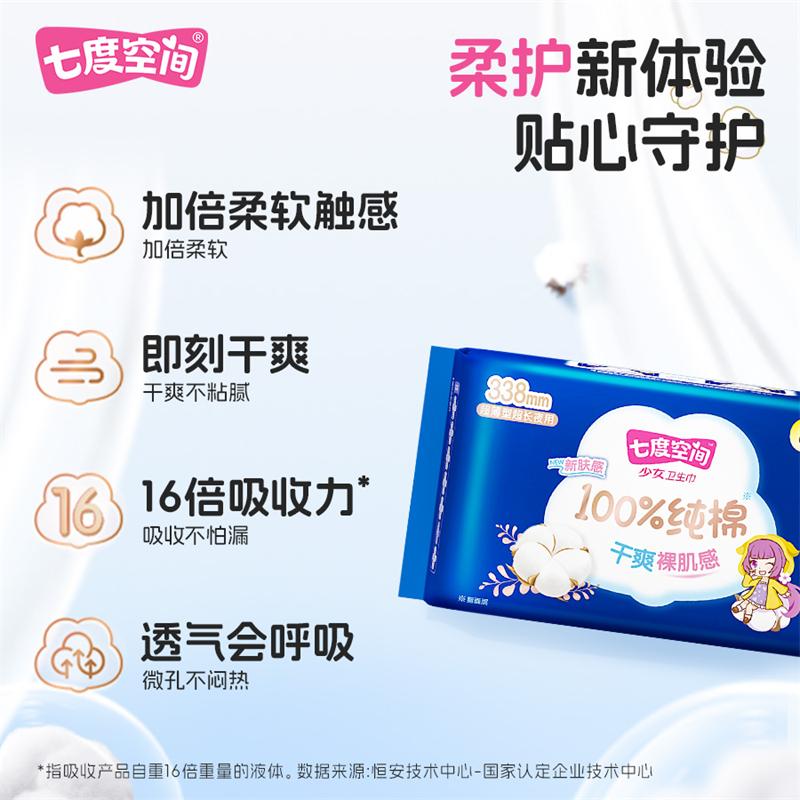 七度空间少女纯棉超薄干爽超长夜用卫生巾338mm 新国标认证
