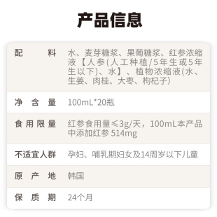 韩国进口正官庄红参元 20瓶口服液过节滋补礼品 红参提取液100ml