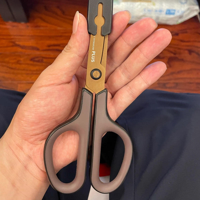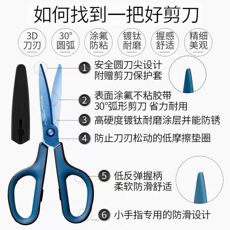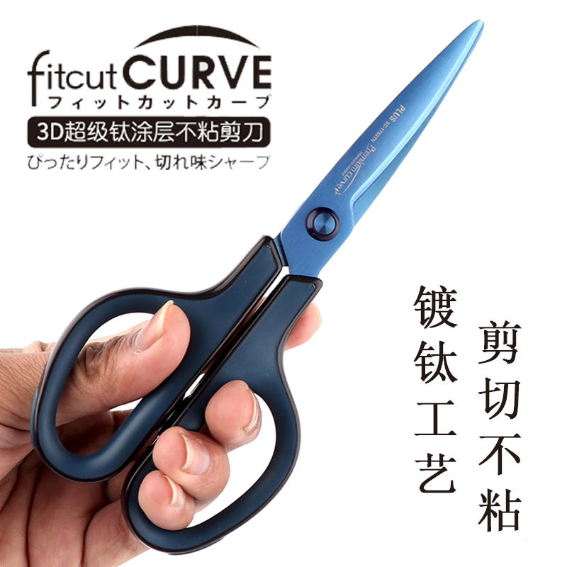 日本PLUS普乐士剪刀镀钛涂层防粘胶家用剪子带保护套学生手工便携式 省力不锈钢便携厨房用品文具拆胶带剪刀