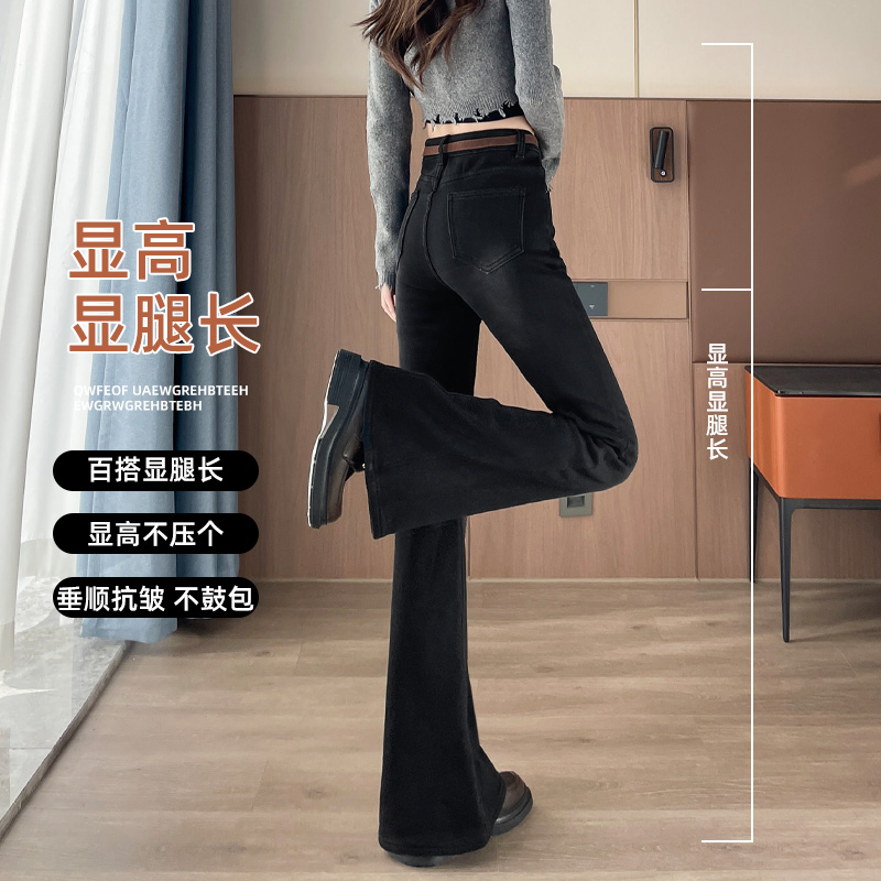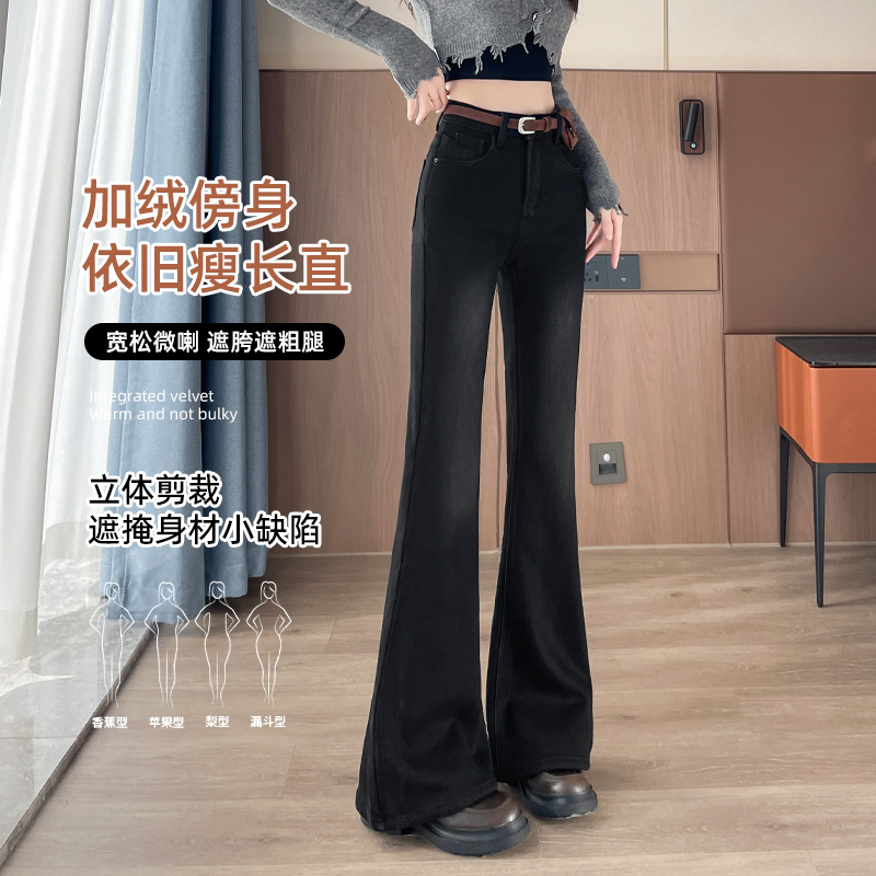复古垂感喇叭裤 微喇牛仔裤 保暖弹力高腰修身 加绒厚款 女黑色秋冬款
