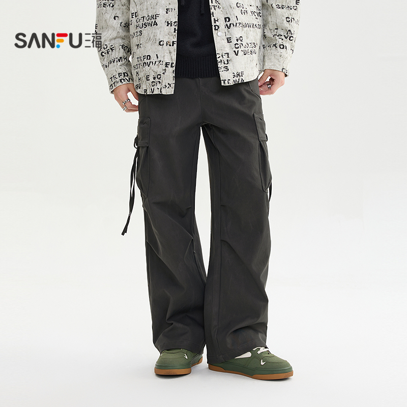 打褶飘带美式 裤 工装 宽松长裤 子男510099 口袋休闲裤 三福2025冬季
