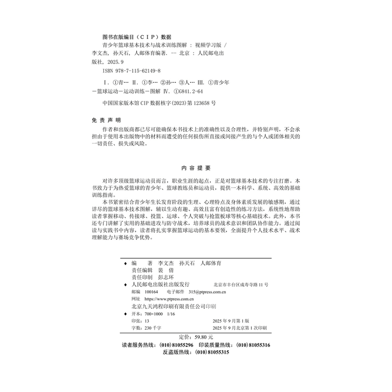 孙天石 人邮体育体育运动 新 青少年篮球基本技术与战术训练图解 社新华书店正版 李文杰 人民邮电出版 视频学习版