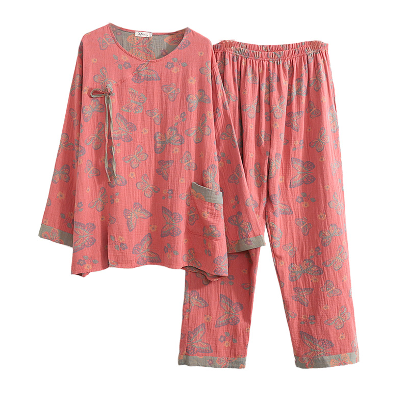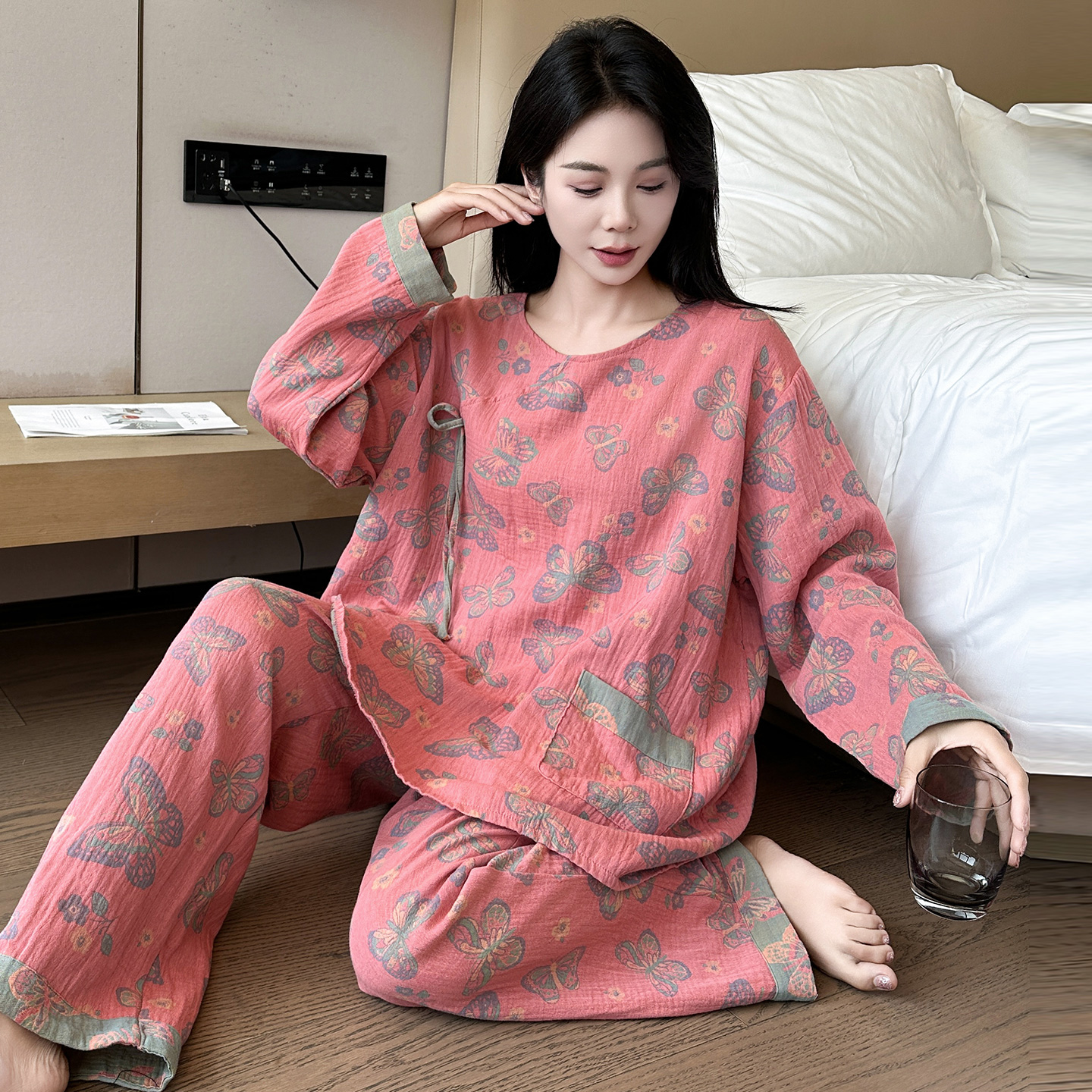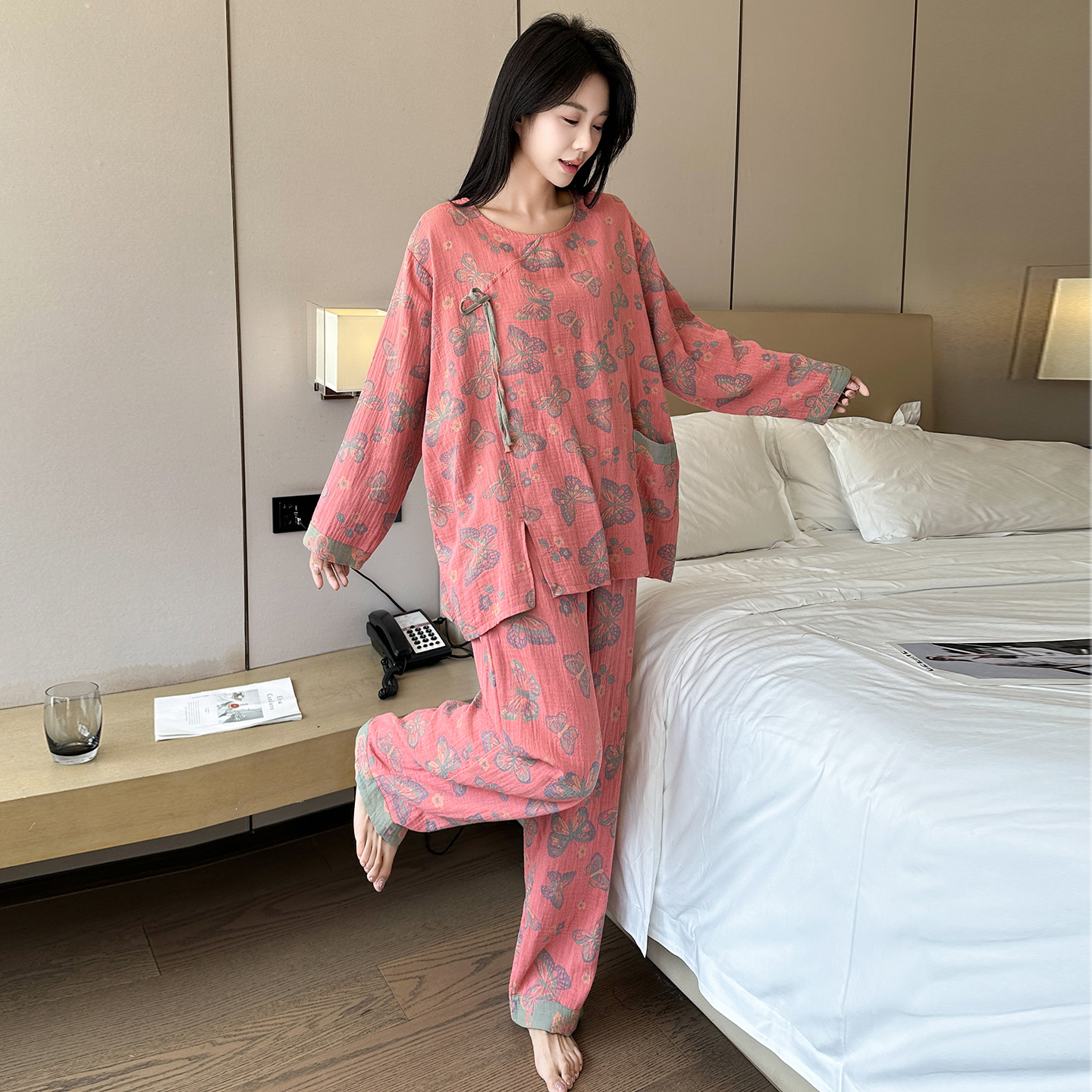 家居服秋 纯棉200斤胖mm春秋双层棉纱宽松长袖 中式 国风睡衣女大码