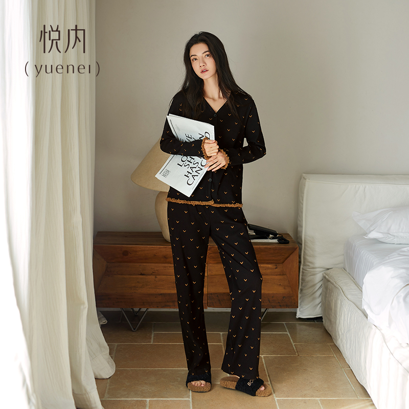 优雅黑色开衫 悦内睡衣女春秋款 家居服休闲时尚 长裤 可外穿 纯棉长袖