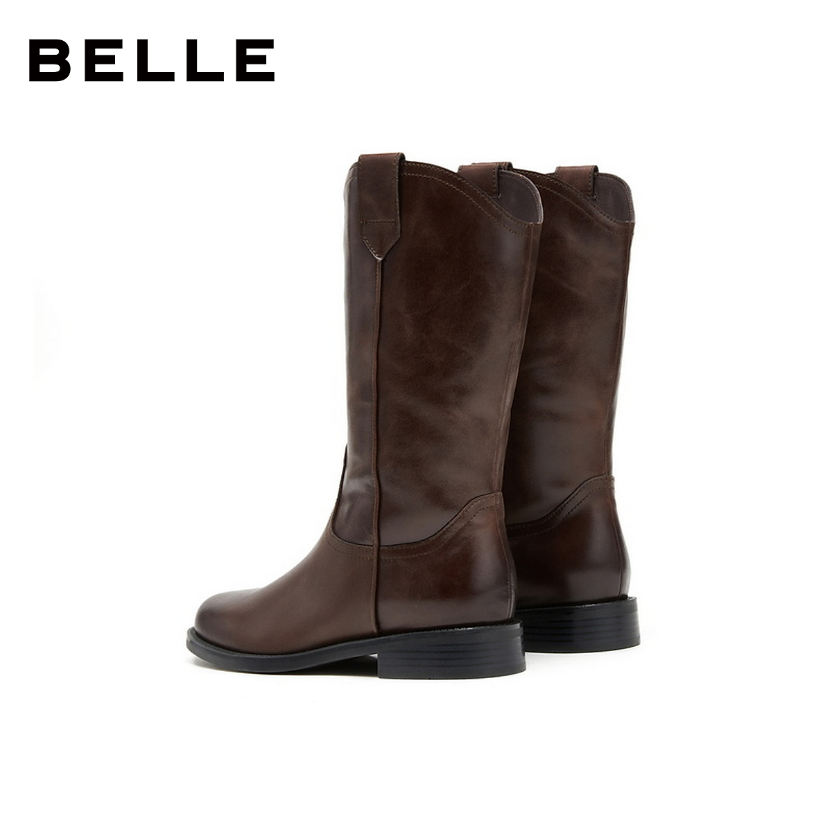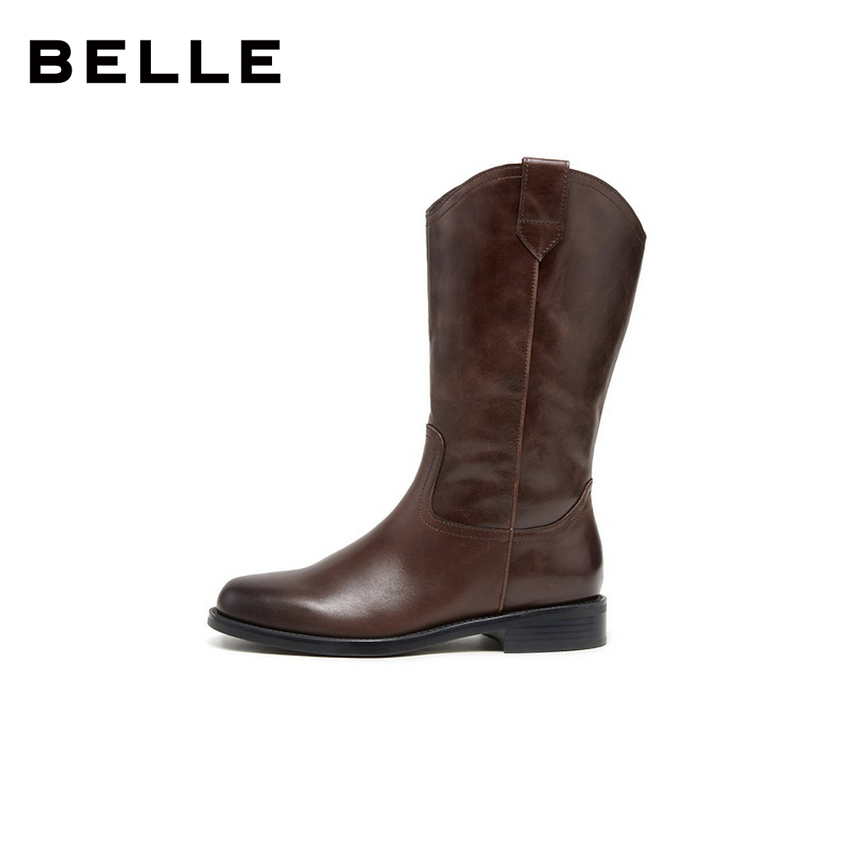 新款 西部靴女鞋 百丽真皮加绒时装 牛皮中筒瘦瘦靴子预 双11预售