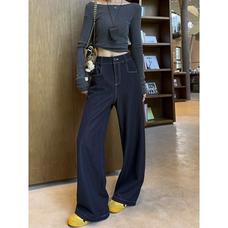 子 老钱风垂感拖地直筒裤 丹宁蓝仿牛仔阔腿裤 女2025春秋高腰休闲裤