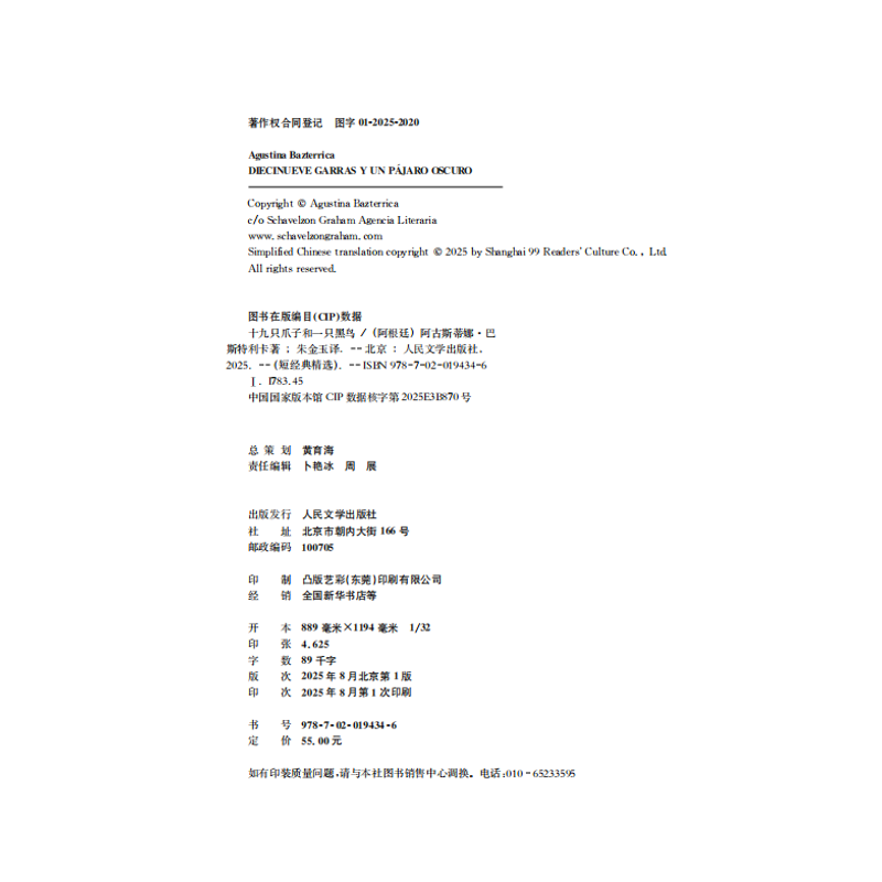 社新华书店正版 〔阿根廷〕阿古斯蒂娜•巴斯特利卡著人民文学出版 软精装 十九只爪子和一只黑鸟