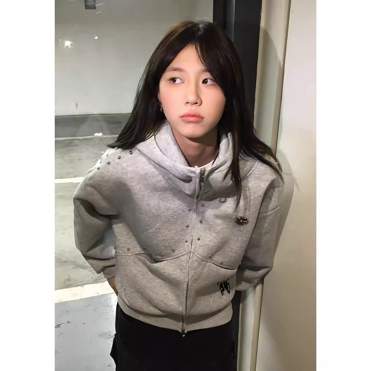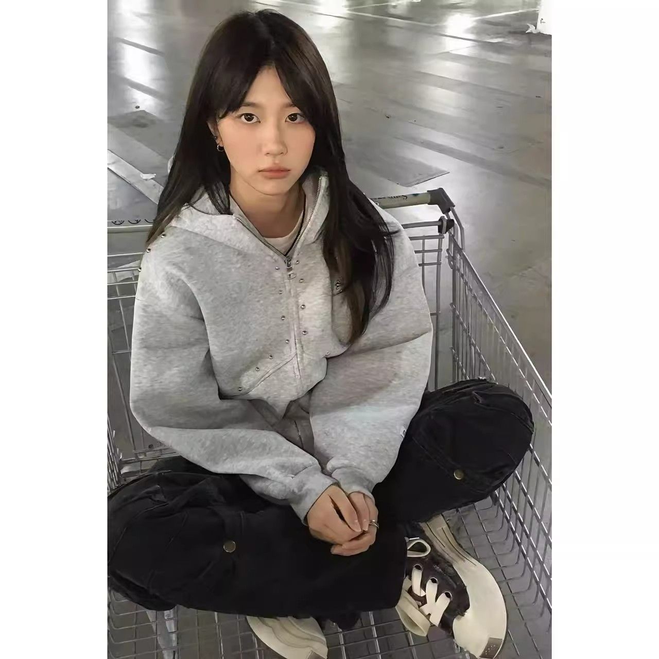 宽松情侣百搭拉链上衣外套 薄款 美式 复古恶魔角铆钉连帽卫衣女秋季