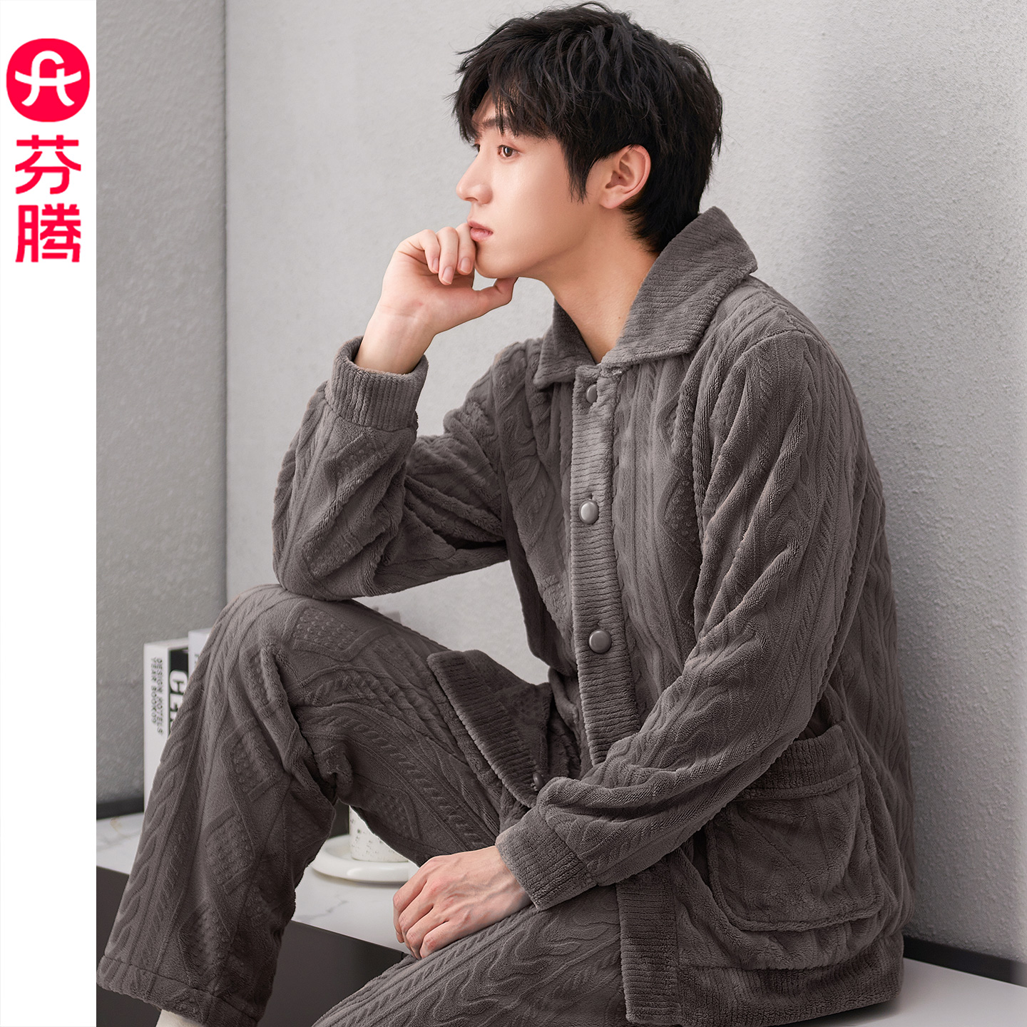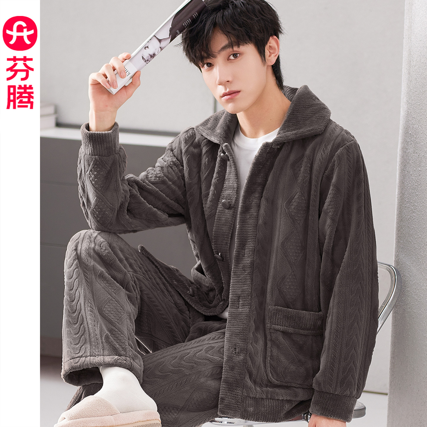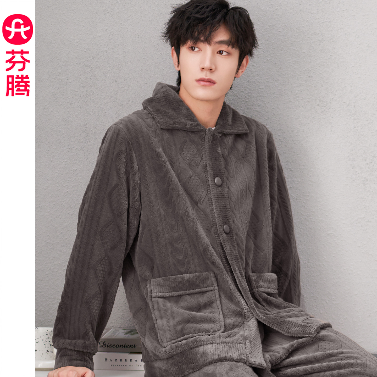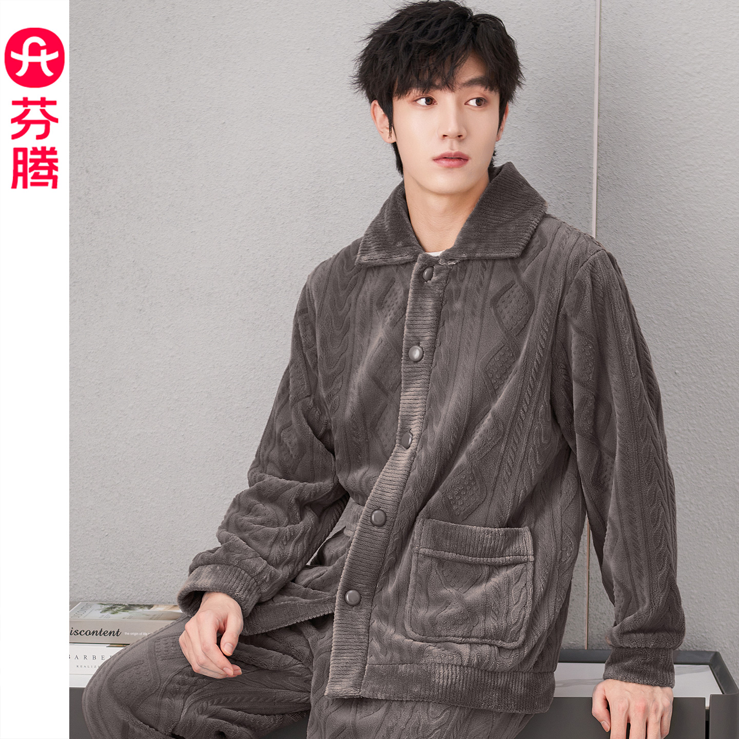芬腾珊瑚绒睡衣男秋冬加厚加绒翻领提花青年大码 外穿家居服2025年