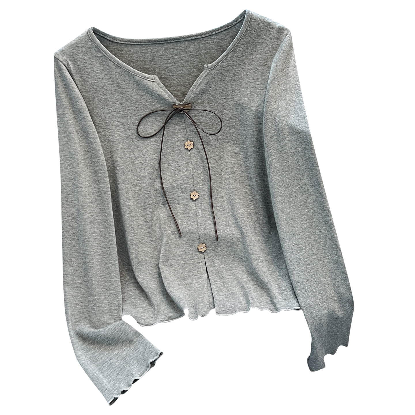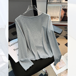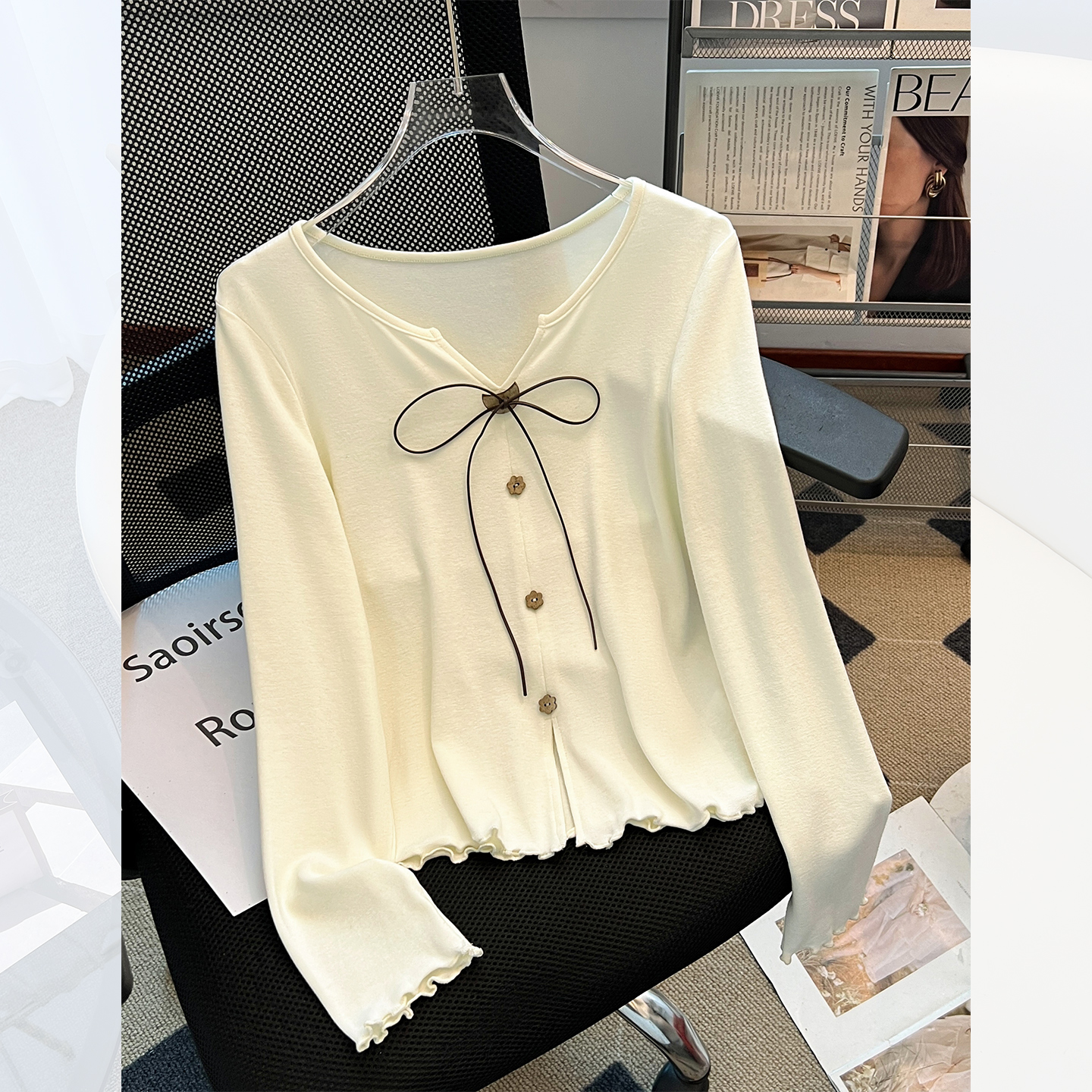 早秋超好看单穿打底衫 2025新款 上衣 T恤女短款 高级感蝴蝶结V领长袖