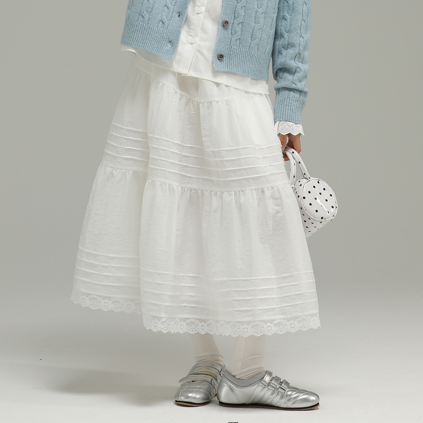 小女森女童春秋白色半身裙气质显瘦a字长裙儿童蕾丝花边压褶裙子