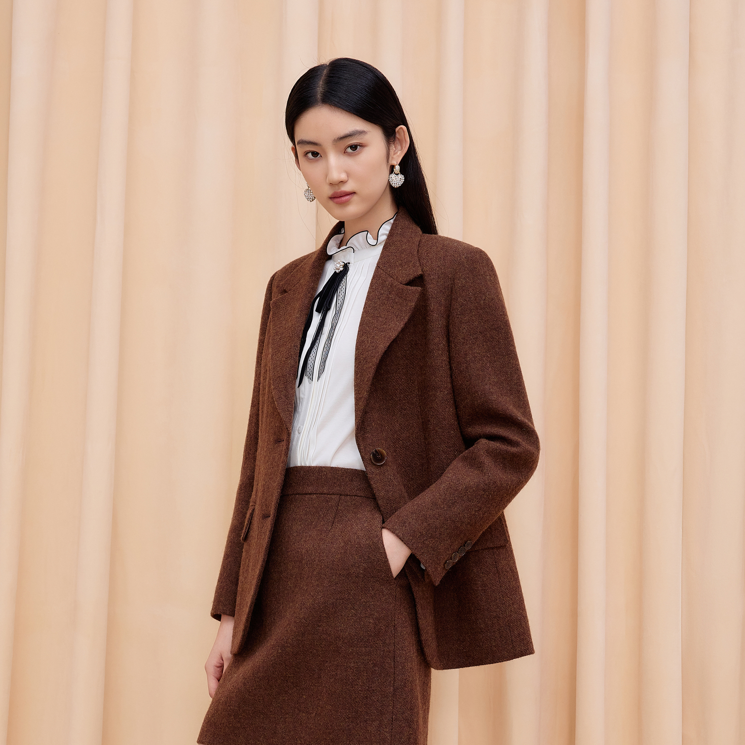 朗姿集团LIME莱茵粗纺羊毛套装 棕色西服上衣A字半裙小个子25冬新