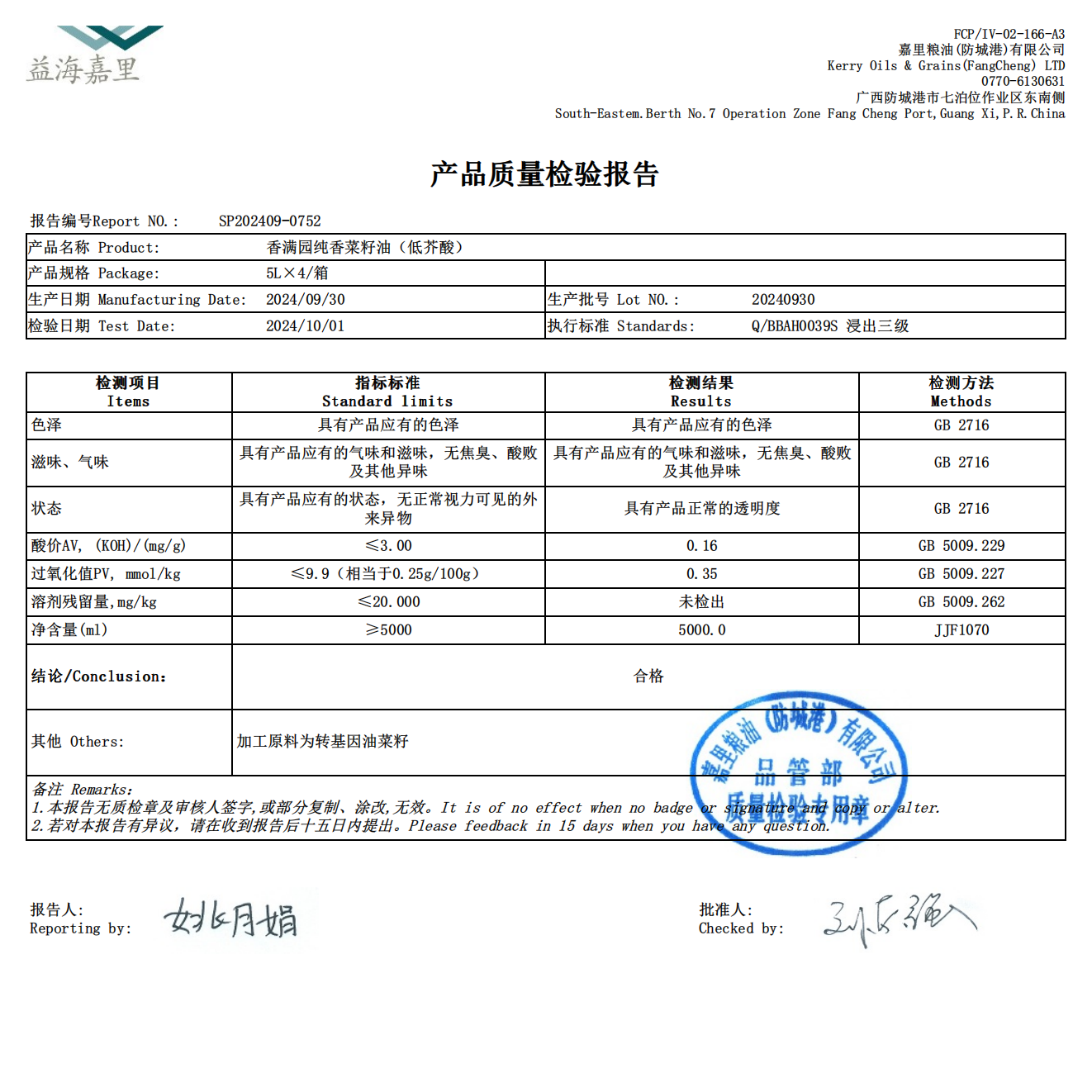 香满园纯香菜籽油5L营养炒菜食用新鲜效期醇香菜籽油 工厂直销