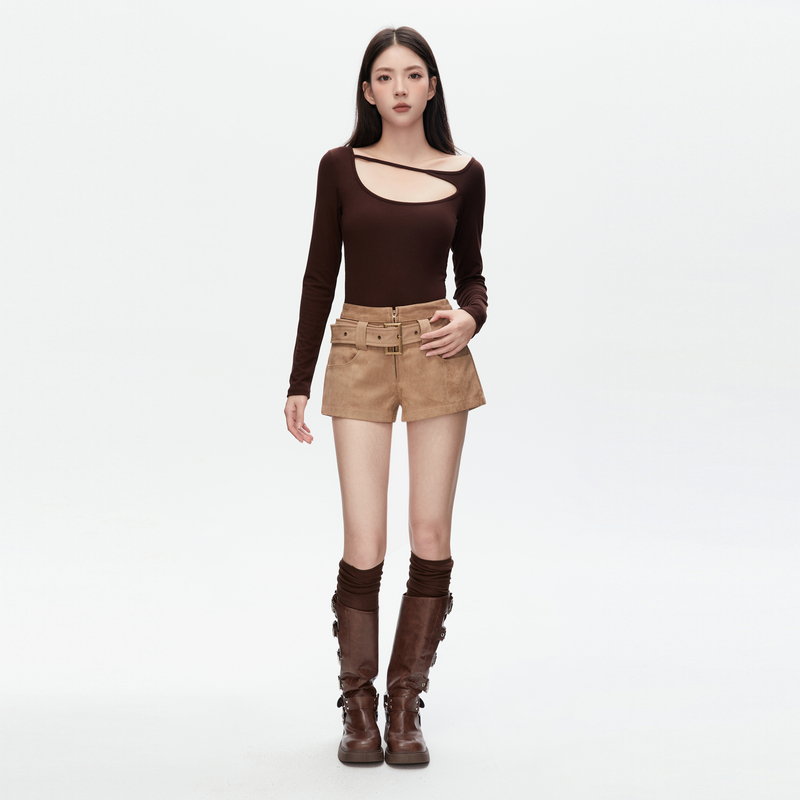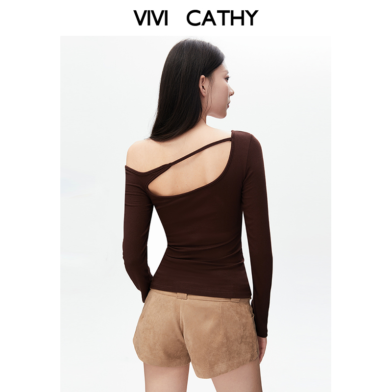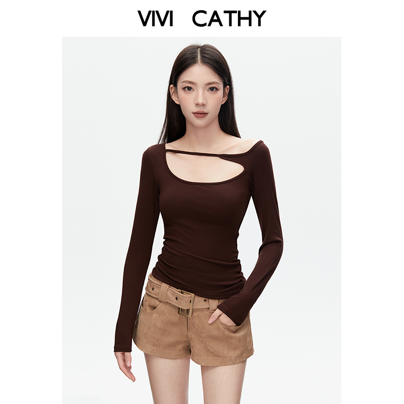 VIVICATHY2025秋美拉德镂空长袖 打底露肩锁骨上衣 T恤女斜领修身
