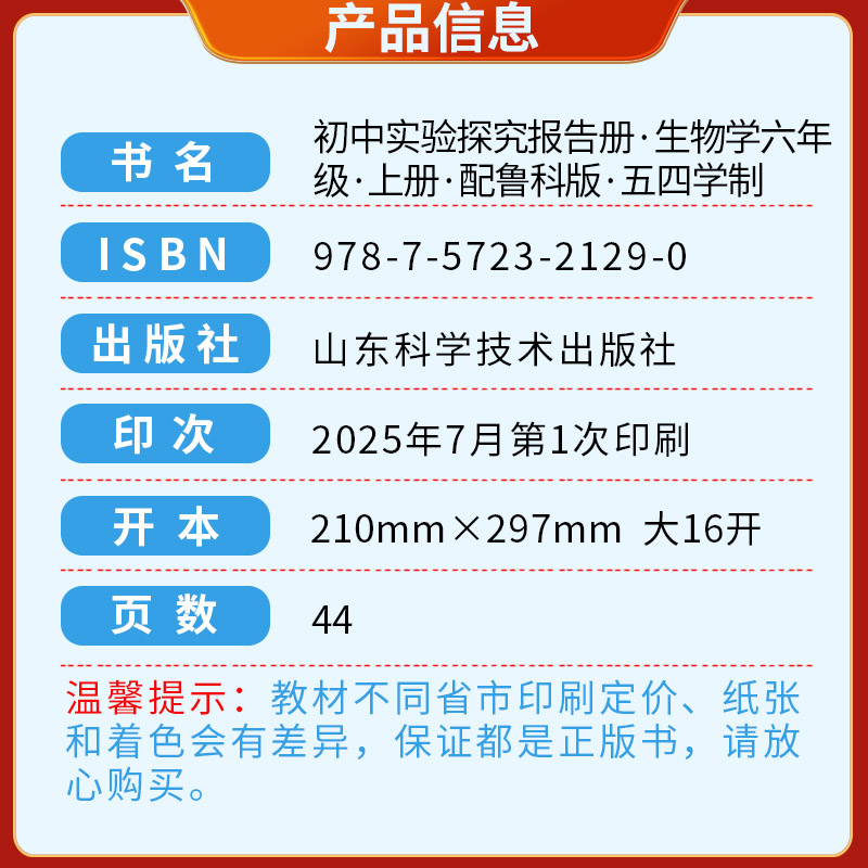 社 山东科学技术出版 2025秋新版 初中实验探究报告词六年级上册生物学五四制鲁科版