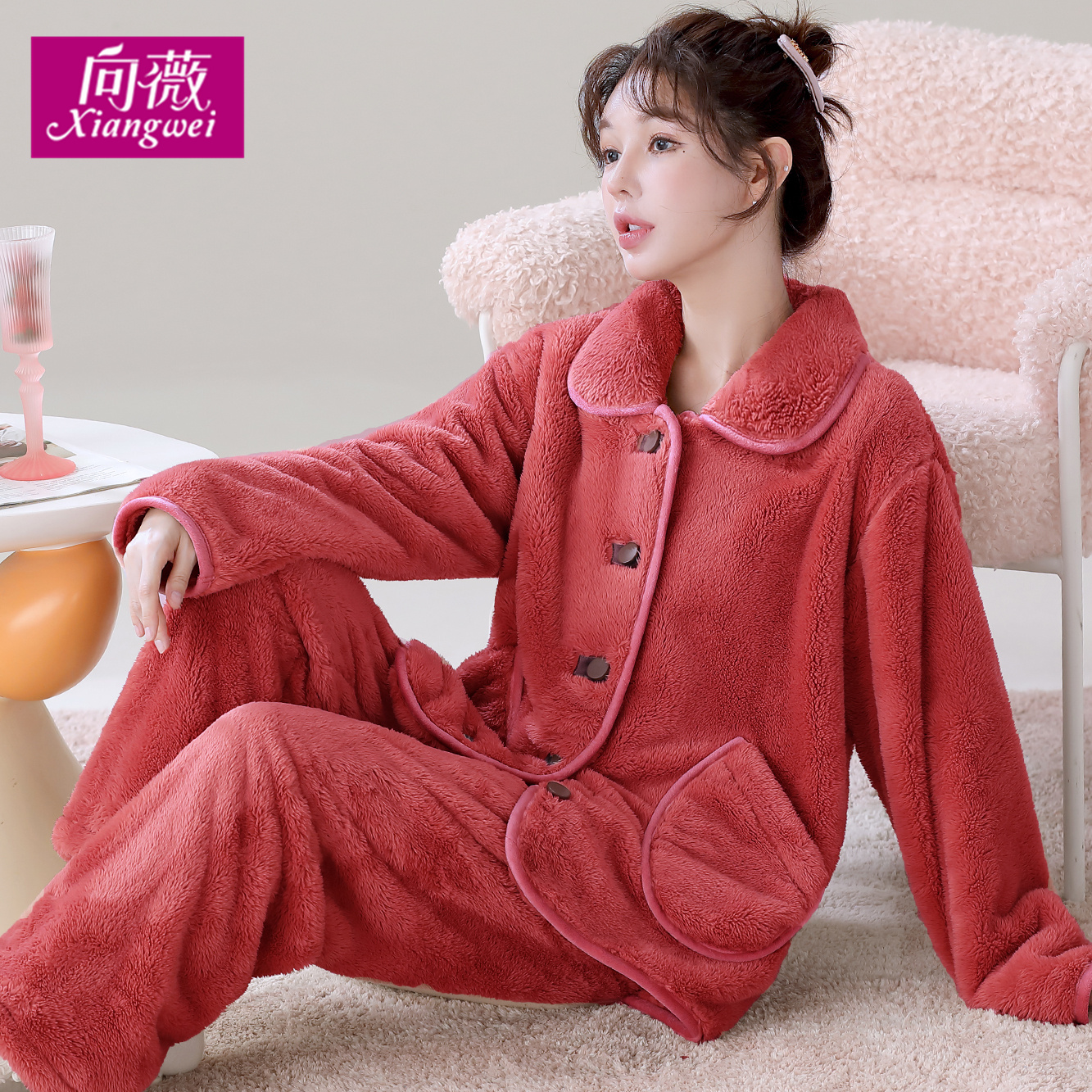 红豆情侣泡泡绒睡衣加厚男士 法兰绒女珊瑚绒防螨抗静电家居服套装