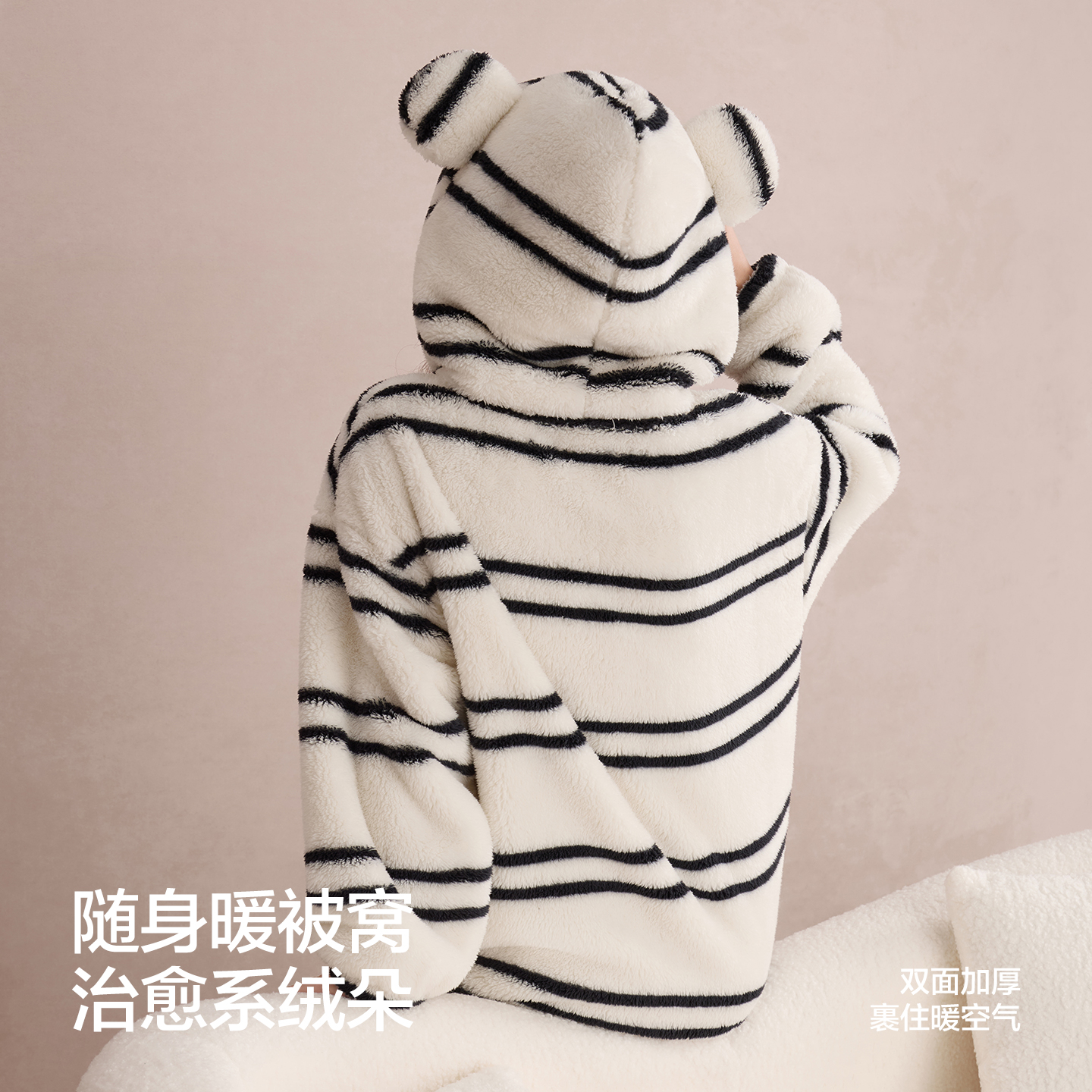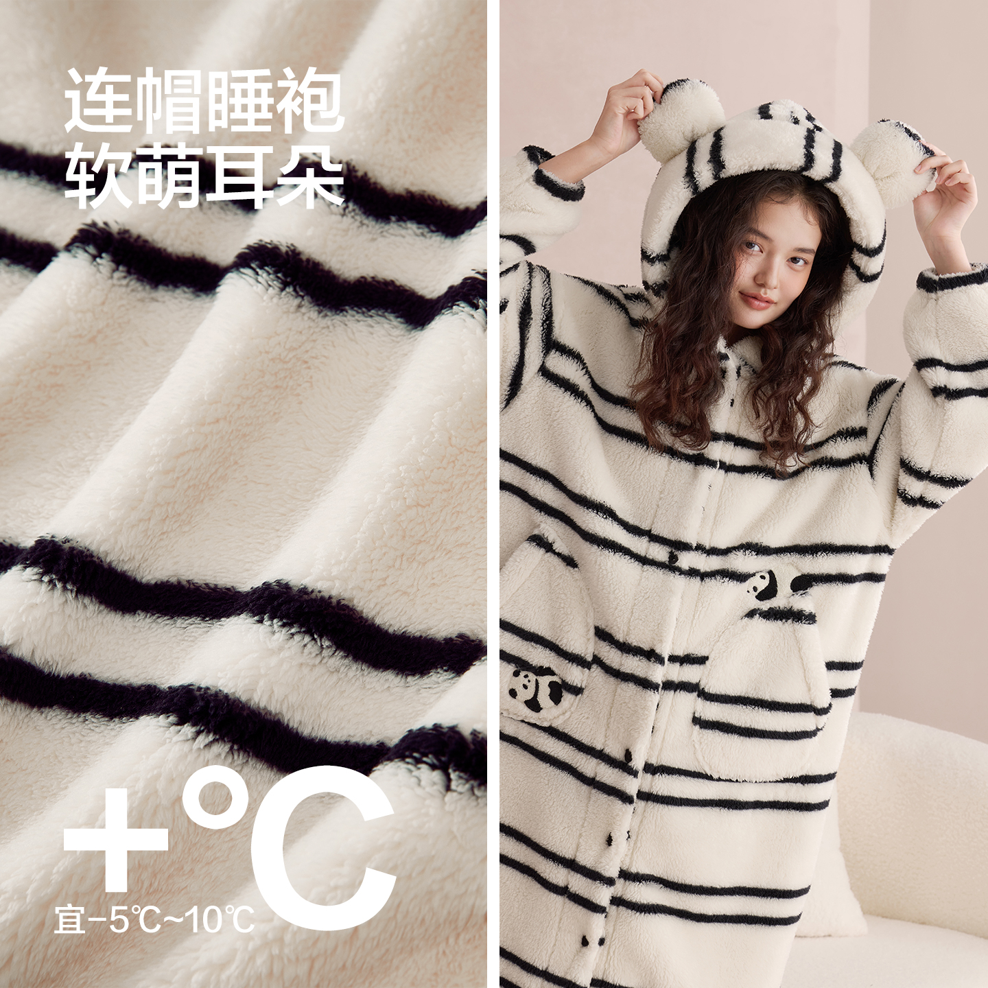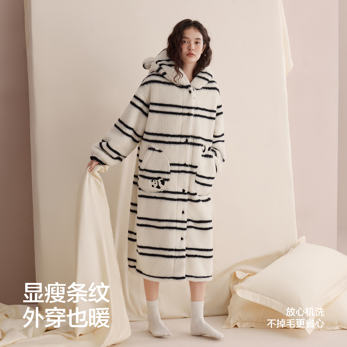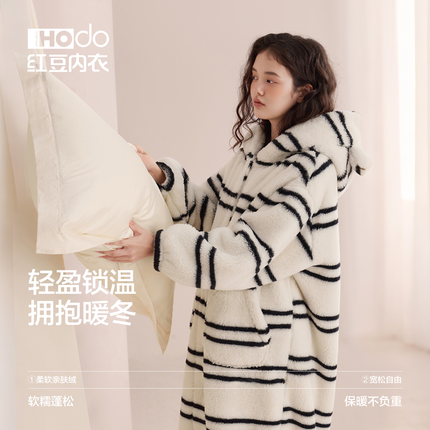 红豆女泡泡绒睡袍可爱连帽防静电条纹外穿家居服珊瑚绒浴袍冬长款