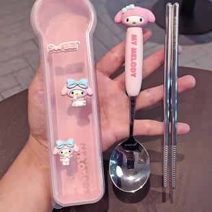 日本库洛米304不锈钢便携餐具盒儿童筷勺子套装 学生专用三件套U0